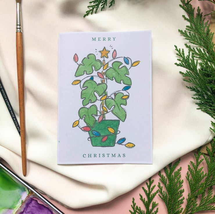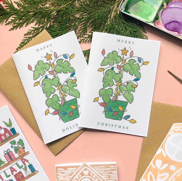 Send festive cheer this year with my Monstera Christmas card multipack! Featuring a cute watercolour monstera decorated with Christmas lights, with the text 'HAPPY HOLIDAYS' or 'MERRY CHRISTMAS'. Each card is A6 size & comes with a kraft envelope - perfect for spreading Christmas joy and perfect for a plant lover!