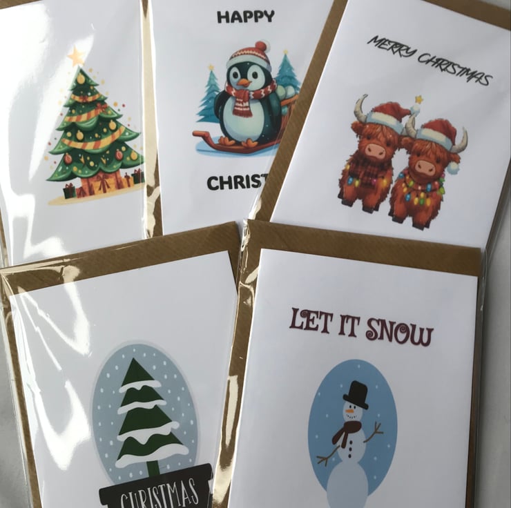2 penguin, 2 christmas tree with lights, 2 Highland cow 2 trees with snow and 2 snow person all with recycled envelopes and comes in cello bags which are biodegradable