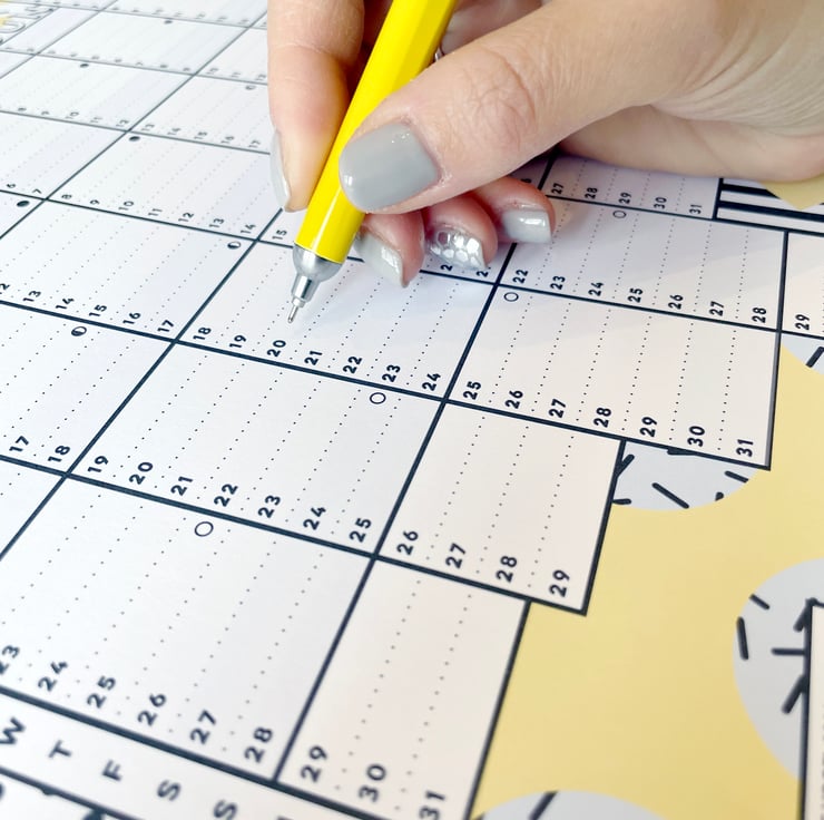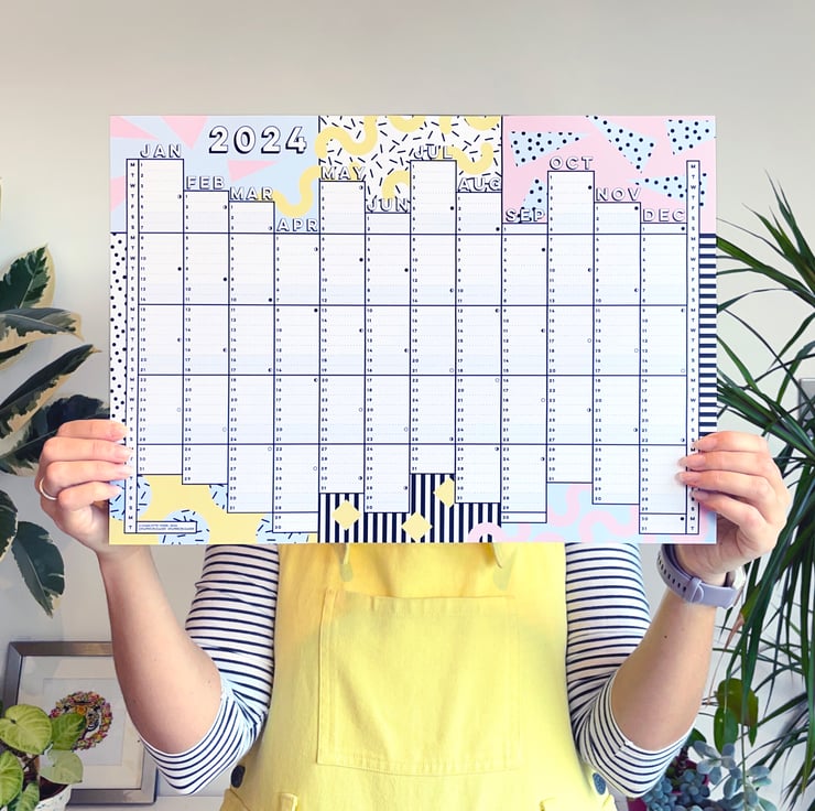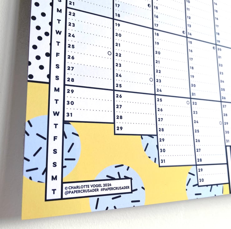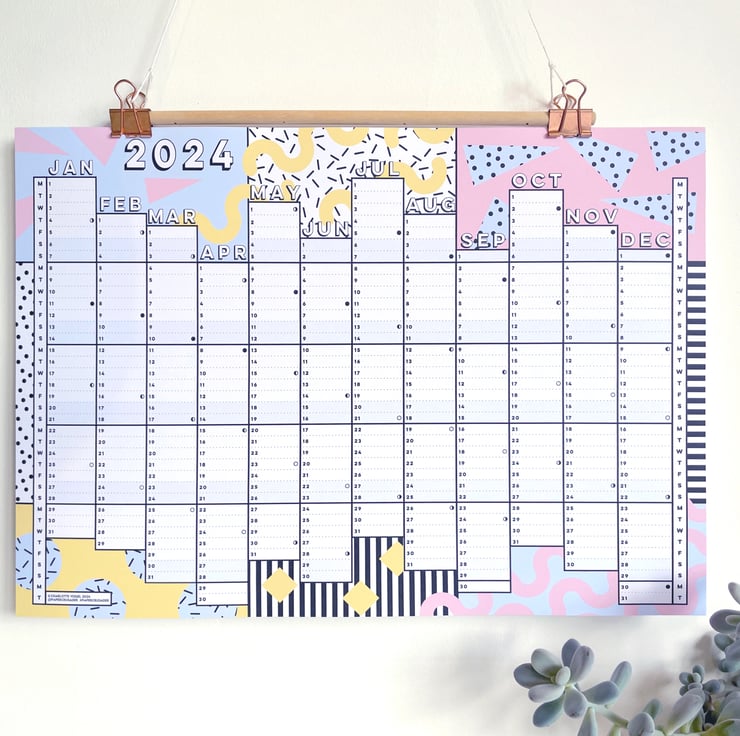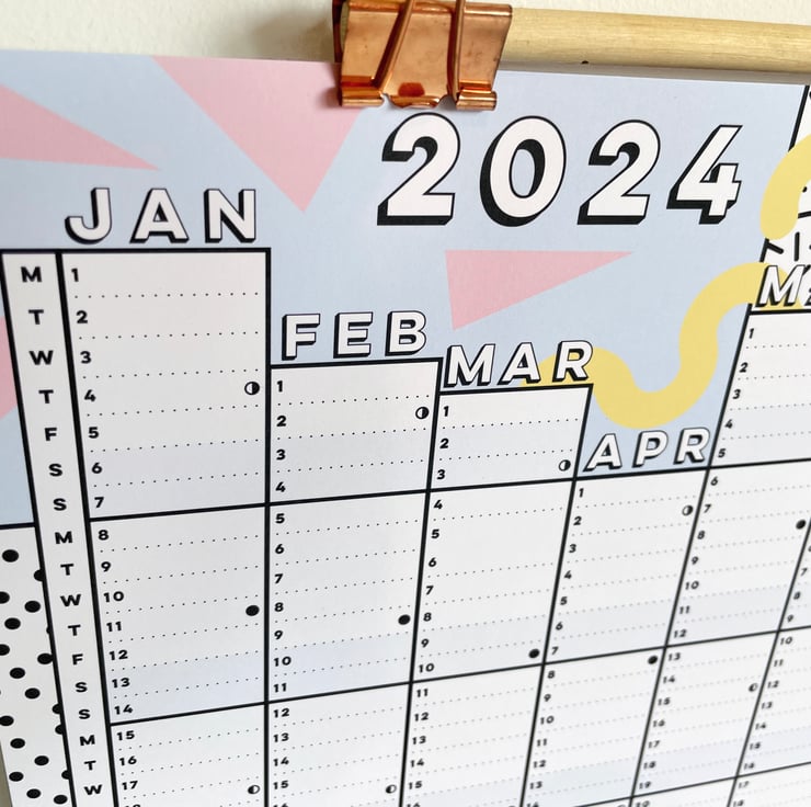 Based on last year's popular design, I have revamped the colour scheme for 2024 with a fresh pastel palette to brighten up your space. Weekends are highlighted with an opaque shade so that it's easy to plot the days of the week. I have included the phases of the moon. The weeks start on Monday. The size is A3: 297 x 420 mm (11.7 x 16.5 in). At this size each day's entry space is 7mm high and 30mm wide.