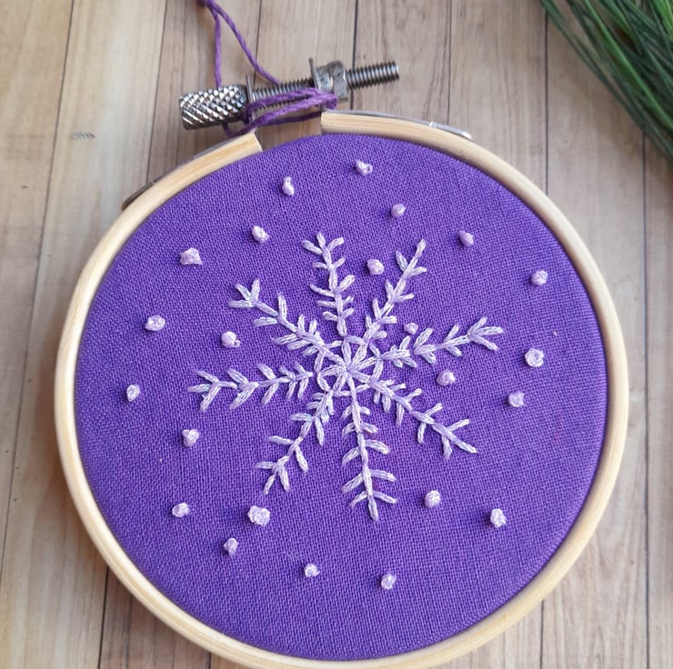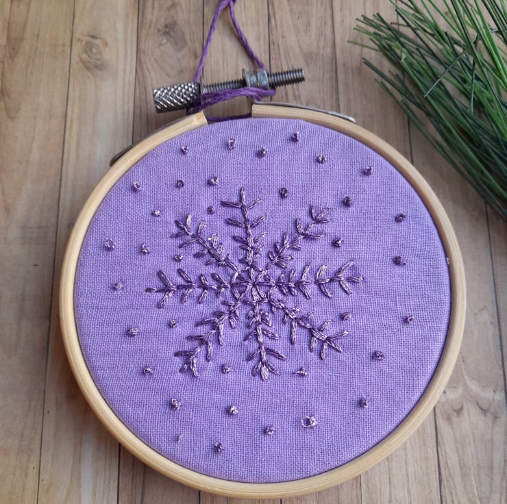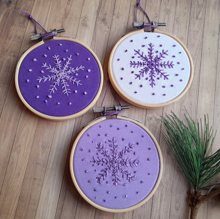 Bring some shimmer and sparkle to your winter decorations with these lovely little purple hand embroidered snowflake decorations.