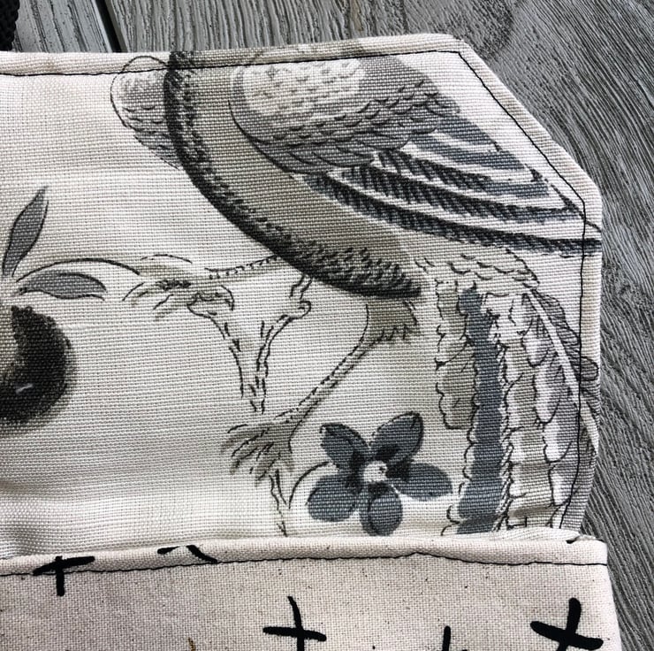 The cotton lining is curtain thickness and again has a cream background with a design of birds and fruit in shades of grey and black. The case has a front pocket, self lined, perfect for keeping papers or leads.