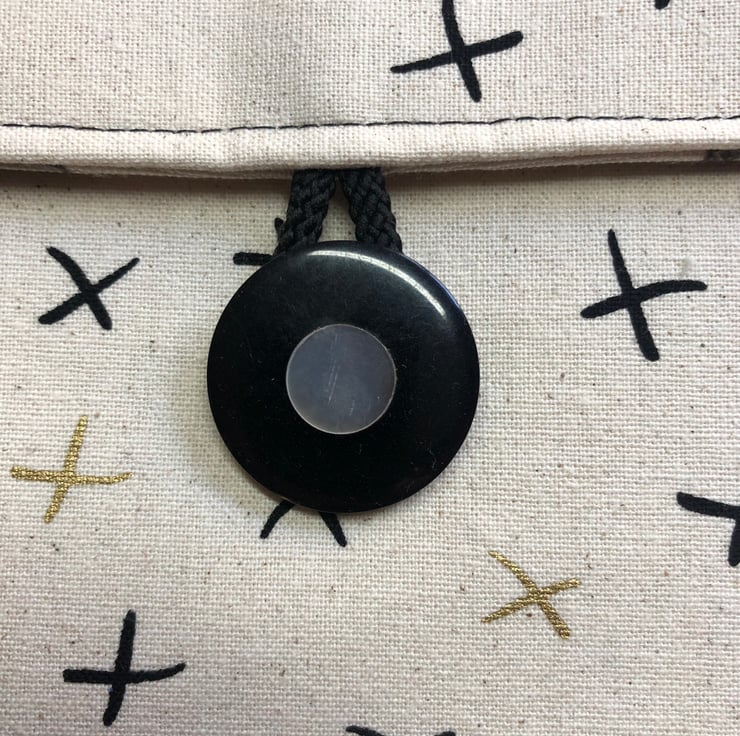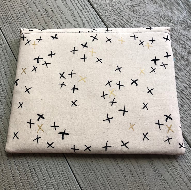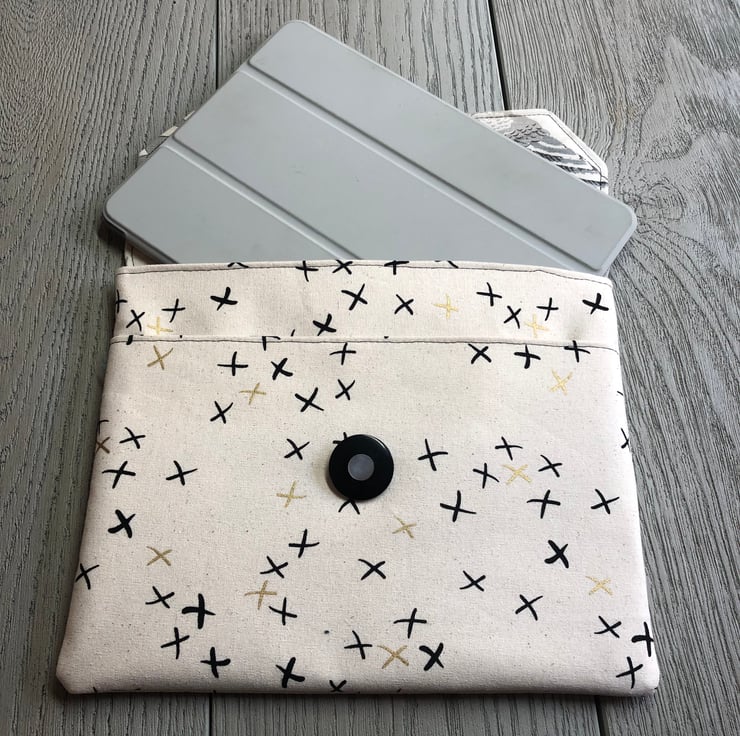 This stylish iPad is based on a Lisa Lam design. The cream linen fabric has a design of crosses in black and gold and the flap is fastened with a large vintage button in black and mother of Pearl.