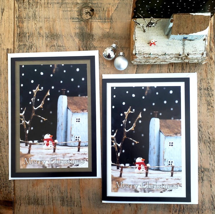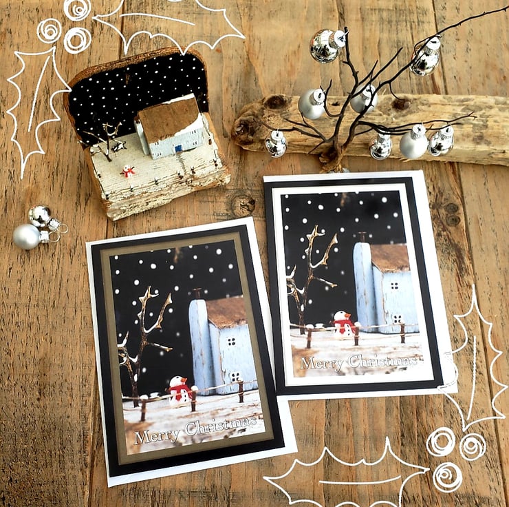 Pack of 6 Christmas cards showing a cute handmade snowman, complete with scarf and carrot nose, this detail is from a driftwood scene made by me. This card has a brownish/gold border, I have another with white border as in pictures, please check out my other listings. Merry Christmas on the front, blank inside for your own personalised greeting.