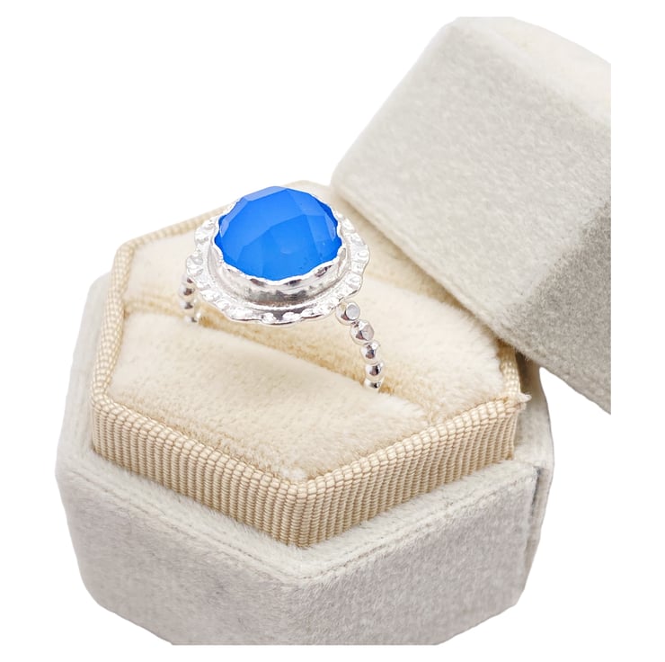 A bright blue rose cut chalcedony has been set in sterling silver and placed onto a beaded silver band.