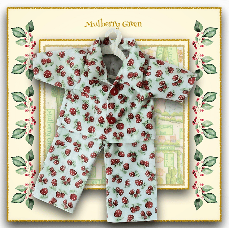 A cute little pair of toadstool print pyjamas to fit the Mulberry Green characters. The pyjamas are made from cotton and are tailored like real pyjamas. They fasten with poppers under two little buttons.