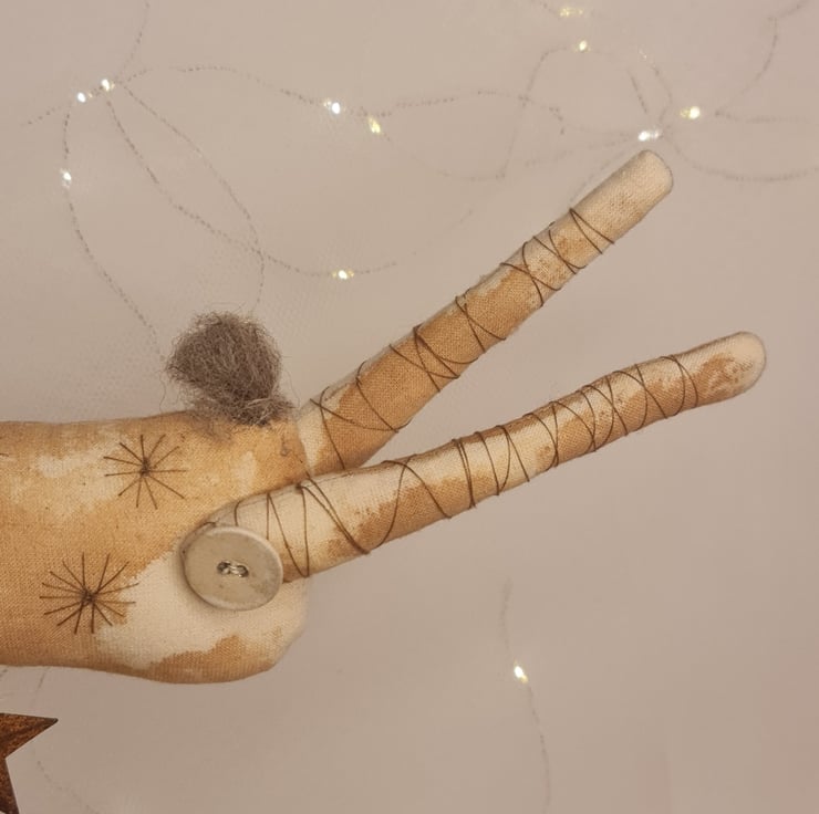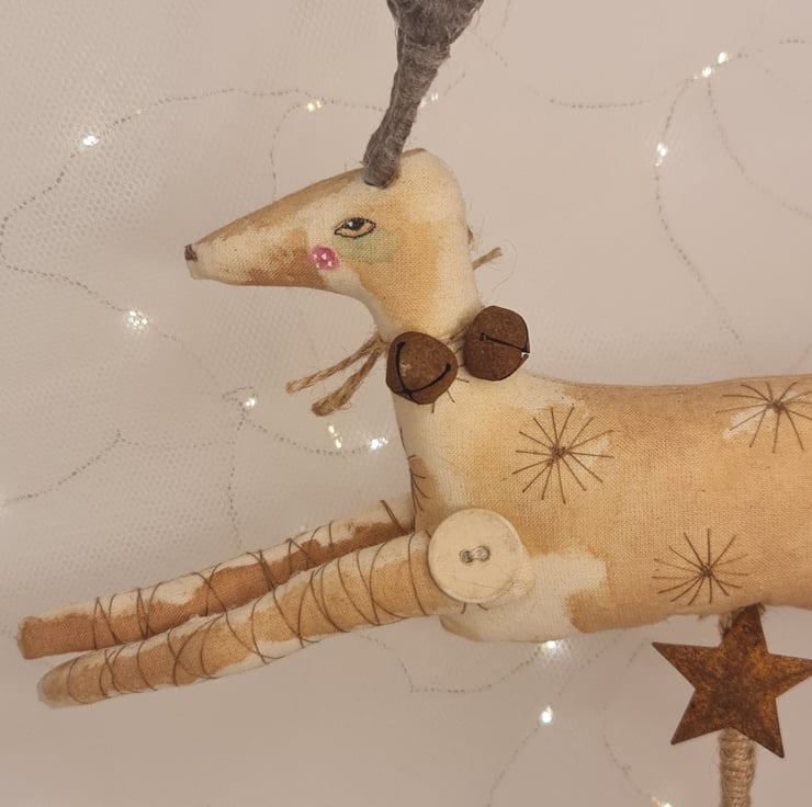 This beautiflul leaping stag is hand and machine stitched in unbleached cotton. Hand stained and painted for an aged primitive feel. Stars are embroidered all over, and, rusty tin bells are tied around his neck with jute. Spun cotton antlers adorn his head, and 1930s shirt buttons decorate each leg.