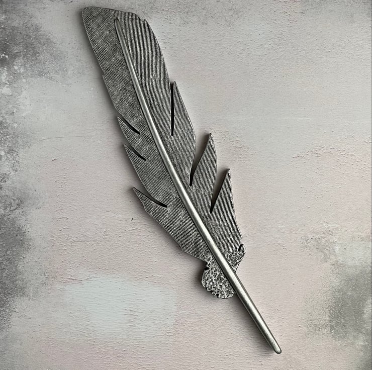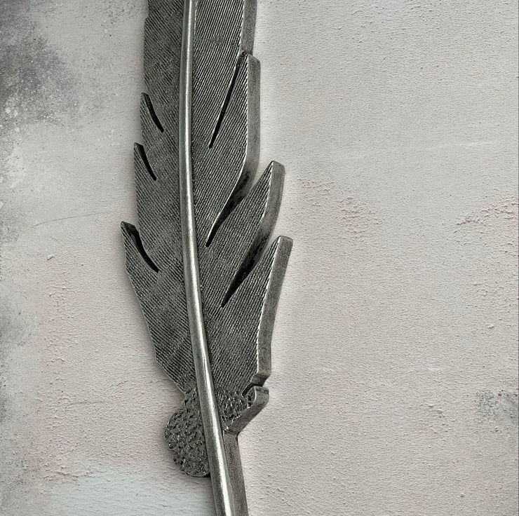 Charming stylish decorative modern art ribbed Feather Wall Decor is handmade using the finest quality plaster of Paris, then hand painted in a silver metallic and finished off with a black wax to highlight the details on the feather.