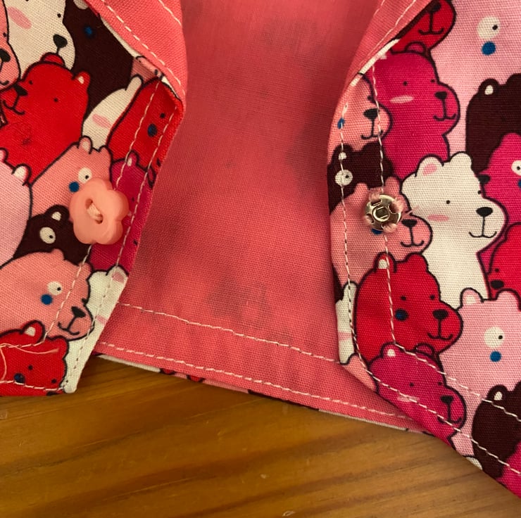 This medium size waistcoat is made to fit a bear/toy approx 13”/34cm tall. The colours are bright multi pinks the print is fun, a collection of teddy heads.