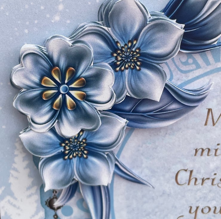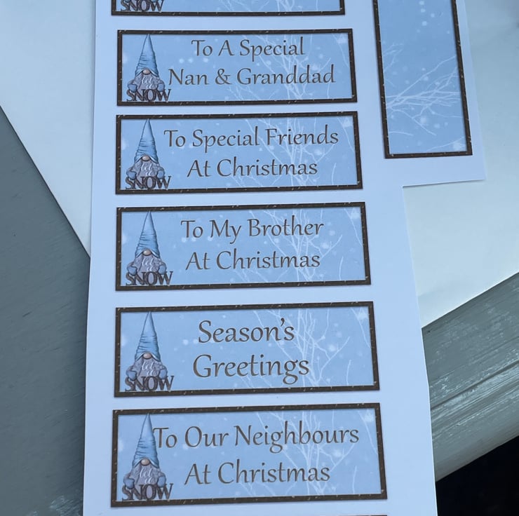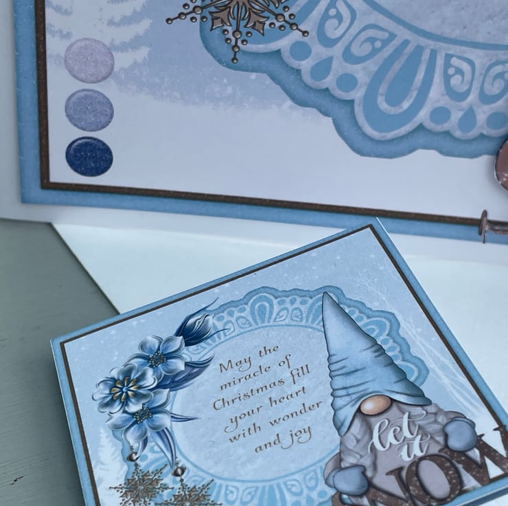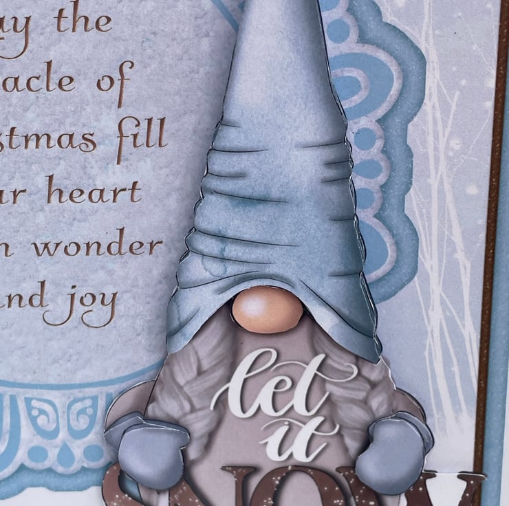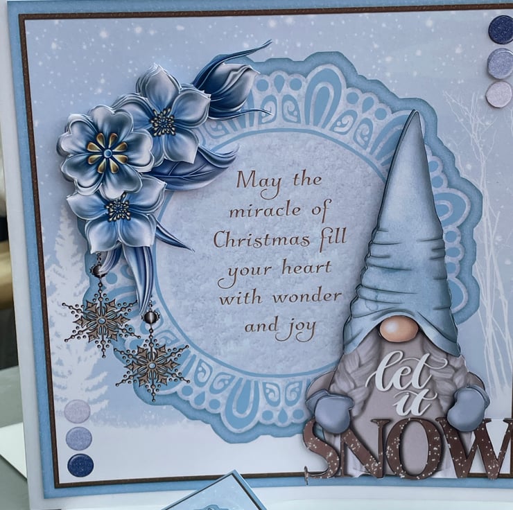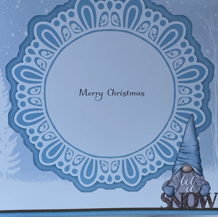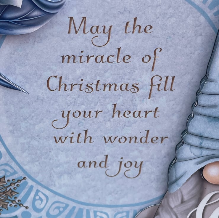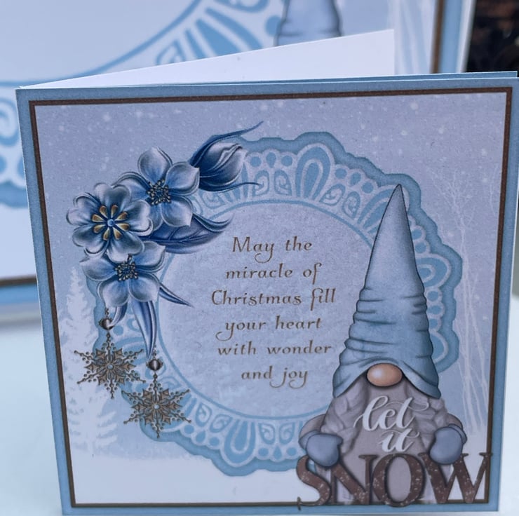 A lovely festive card with a cute gnome wishing you a happy Christmas. This 18x18cm card features a cute gnome in a big blue hat and mittens. It is holding a notice that says Let it Snow. There is a lace effect wreath which is adorned with blue flowers and snow flakes. There is a verse in the middle of the wreath. It says 'May the miracle of Christmas fill your heart with wonder and joy'. Inside the card is a matching insert with the greeting Merry Christmas. There is the possibility to change the greeting to a more personal family greeting or different wording, just about anything you would like. See the final photo for inspiration. The card comes in a luxury pearlised envelope. the card comes with a matching gift tag.