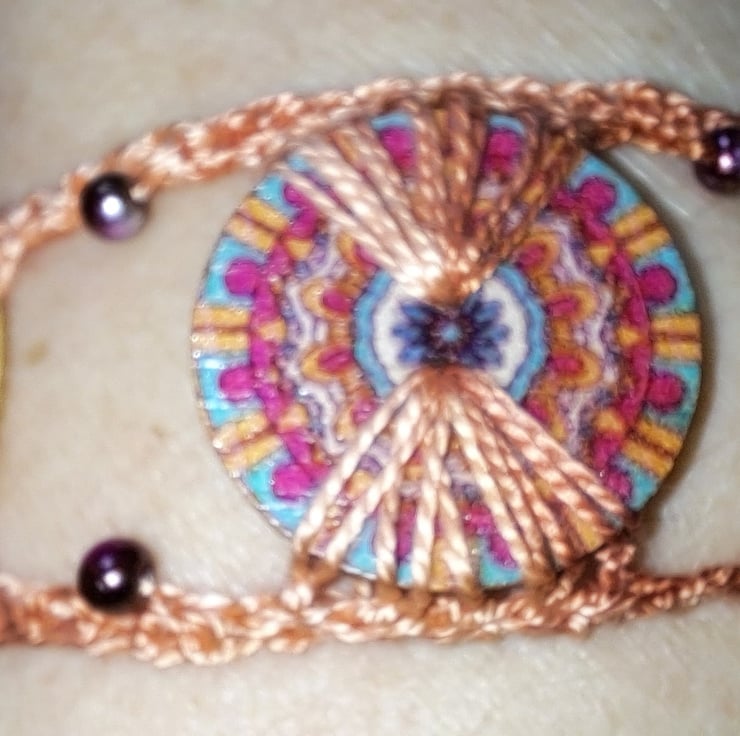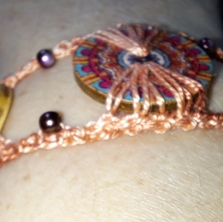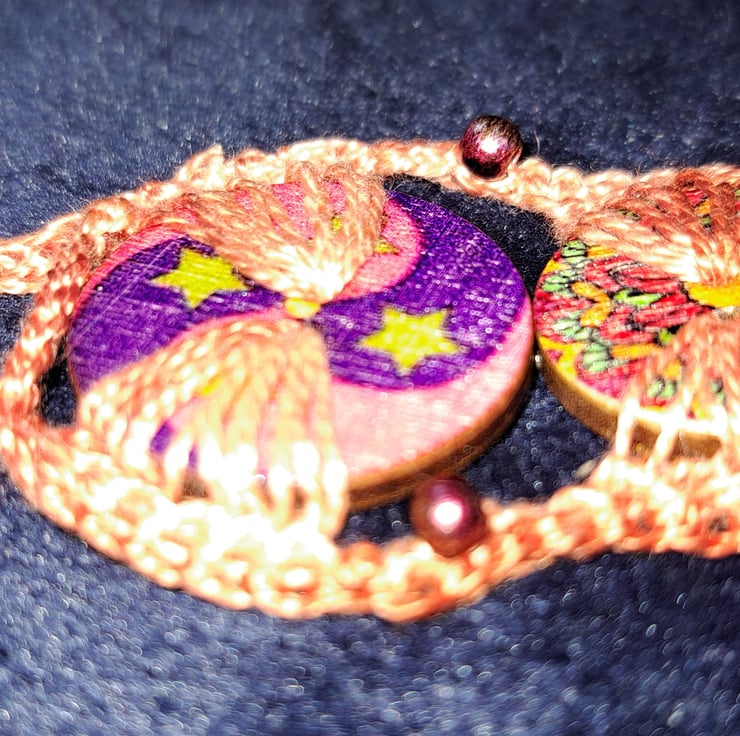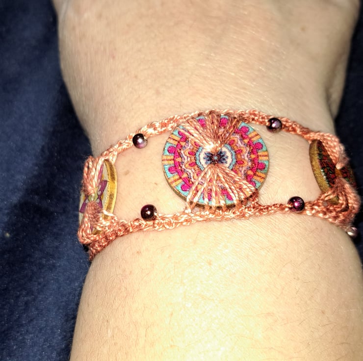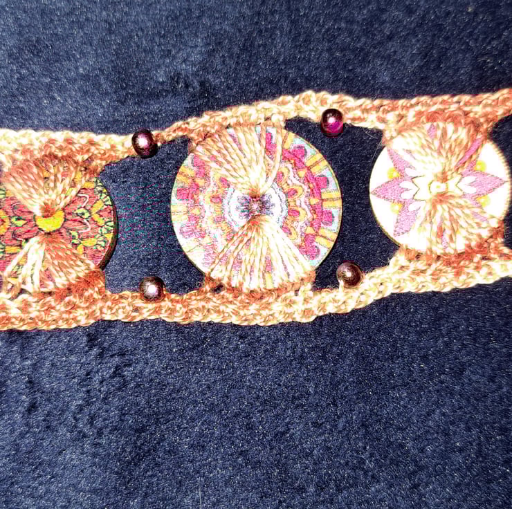 This pretty crochet button bracelet has the addition of glass pearls available in various colours and styles.