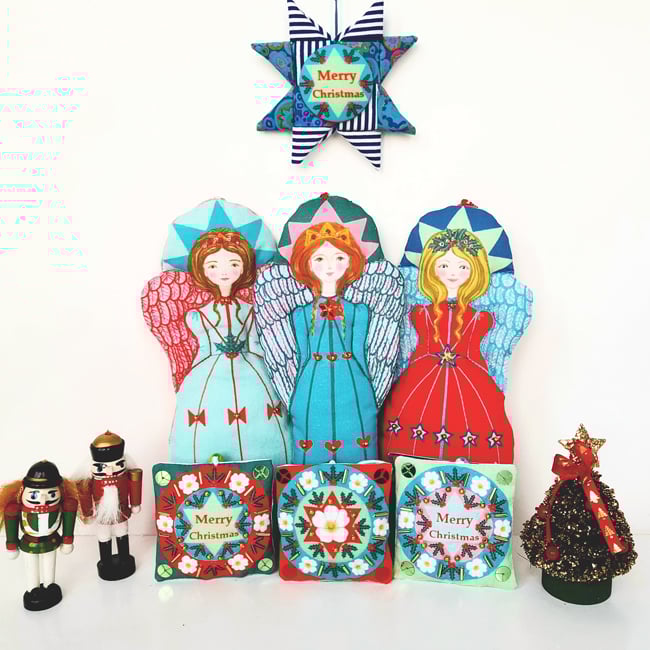 Images 3 and 4 show size 38 mm covered buttons and an Angel ornament made from this panel, last image shows Angels and ornaments made from similar panels which are also available.