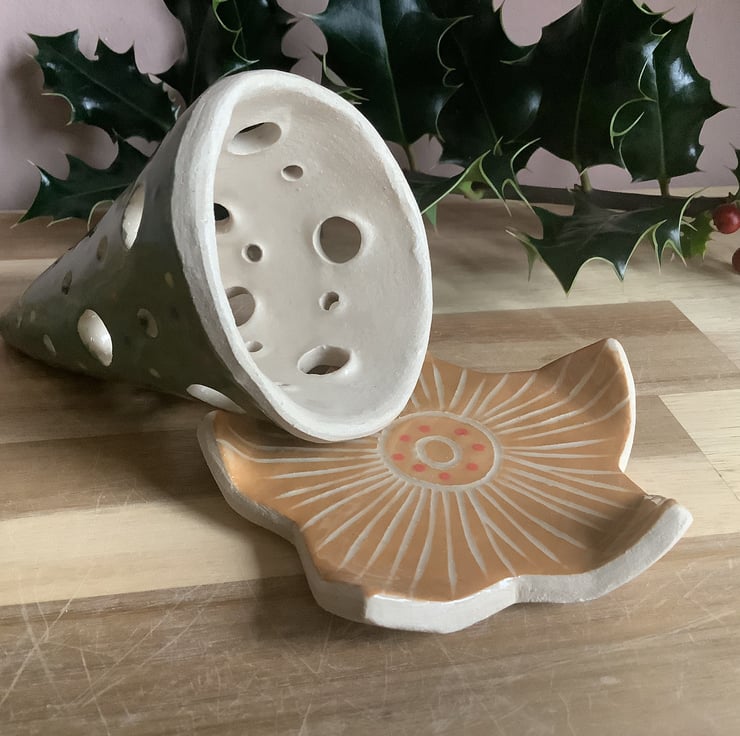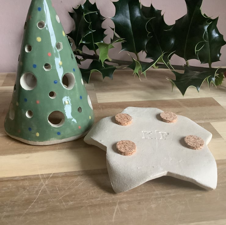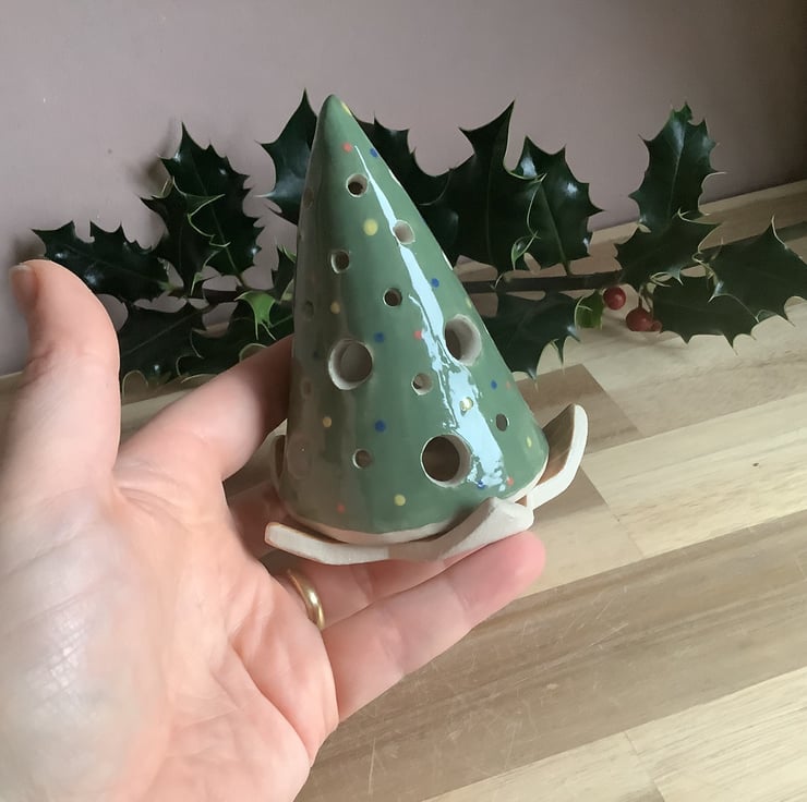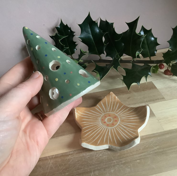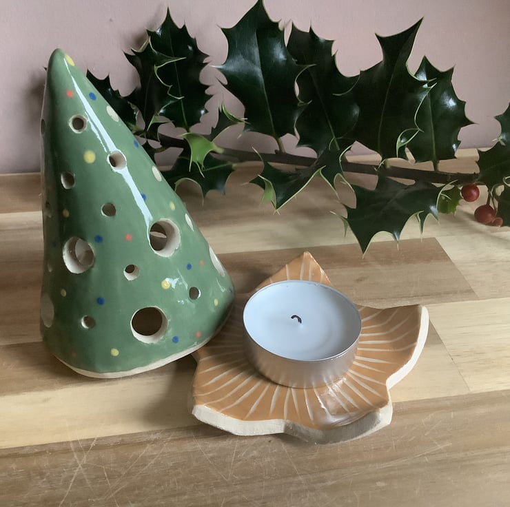 Handmade stoneware pottery Christmas tree tea light burner, will help create a cosy glow this Christmas, decorated with coloured slip with contrasting dots of colour.