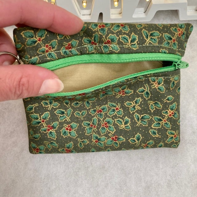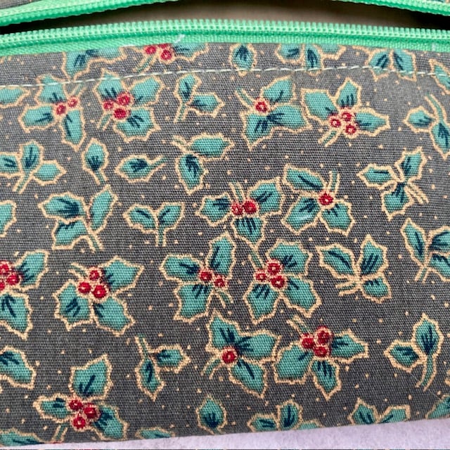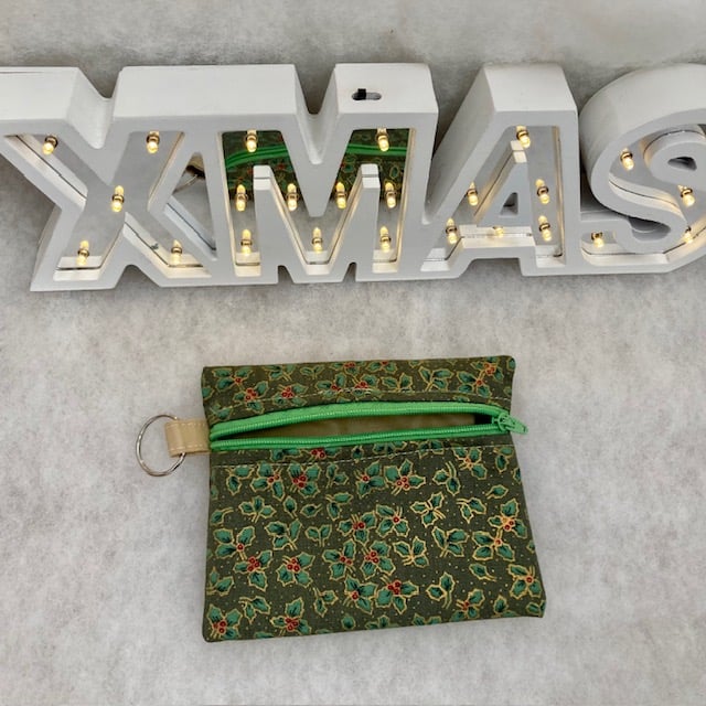This small zipped purse features gold outlined small holly leaves on a green background fabric.