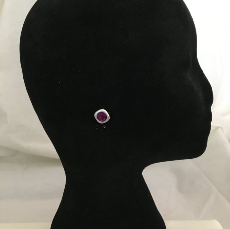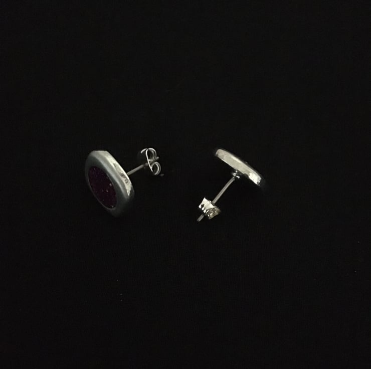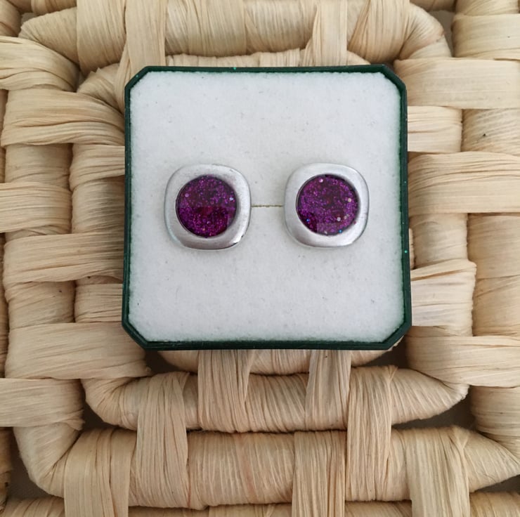 Pretty handcrafted mulberry pink stud earrings with satin silver edging.