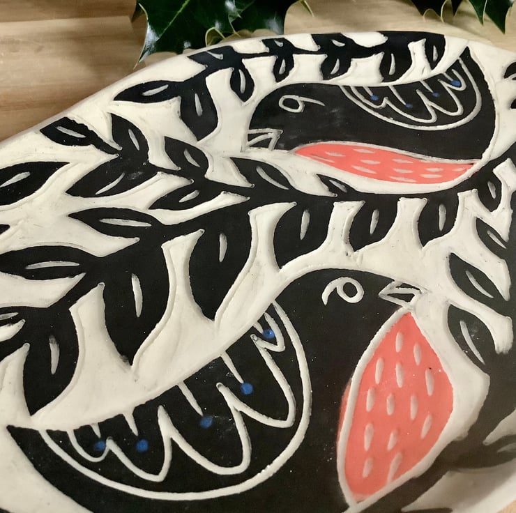 The design is carved by hand into layers of coloured slip. Making each one slightly different and unique.