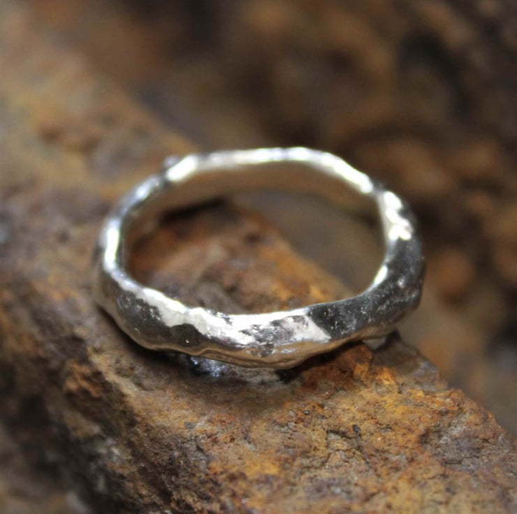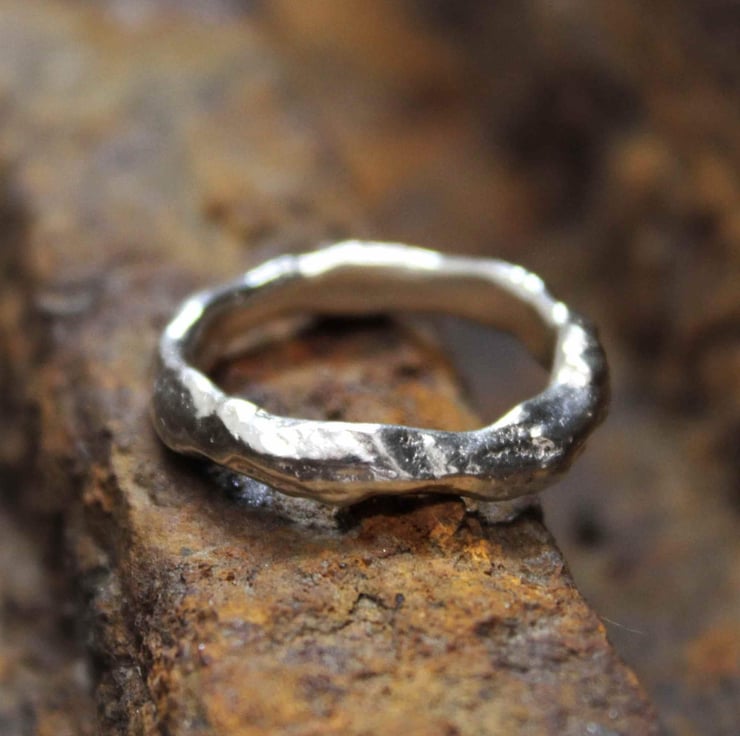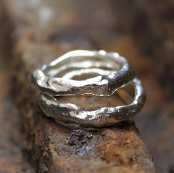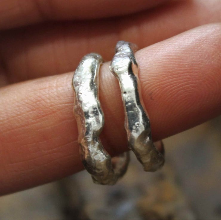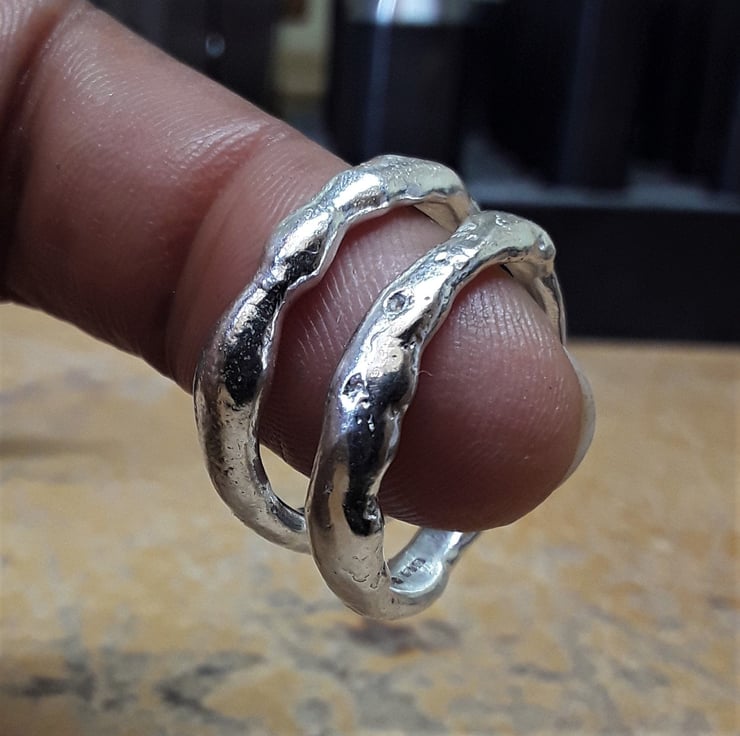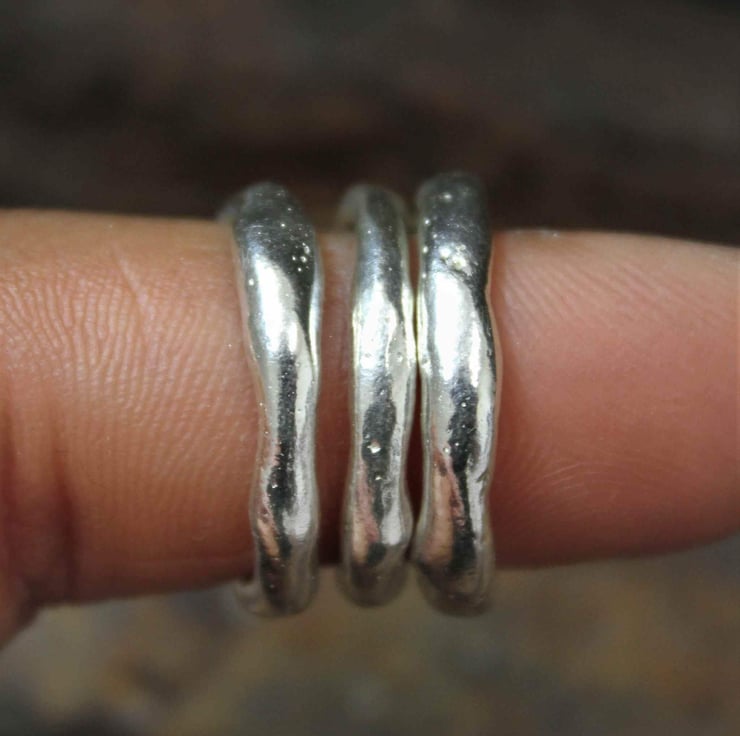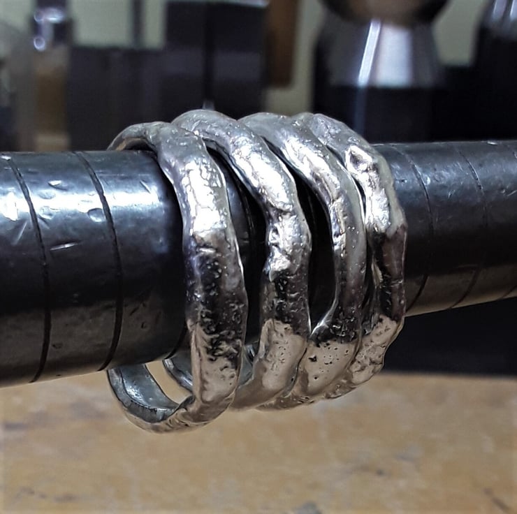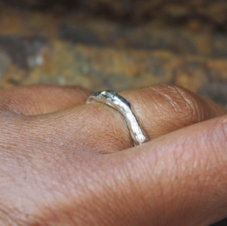 This is a freeform ring that we make by melting and fusing little pieces of sterling silver into a long rod. The rods come out very rough with sharp edges so we file and sand them to remove these. We cut the rod to the right length and turn it into a ring.