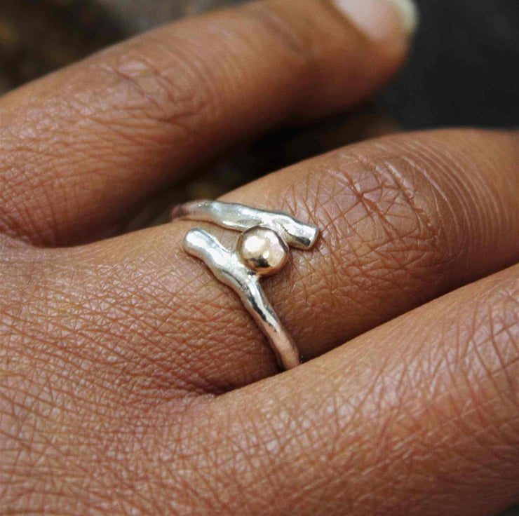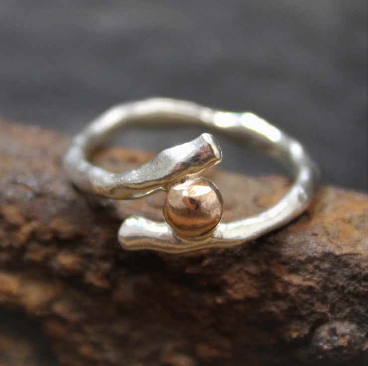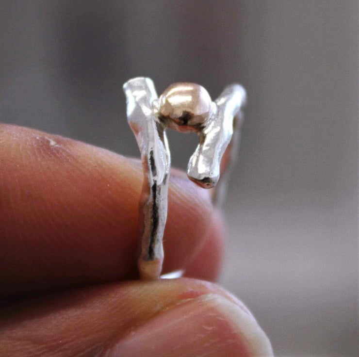 The silver is melted and then organically shaped whilst molten creating a unique wire every time on is made. I then make the 9ct rose gold pebble using the granulation method. The ring is then formed and the pebble is fused to the ring. The gold accentuates the ring beautifully and the contrast in colours is really beautiful.