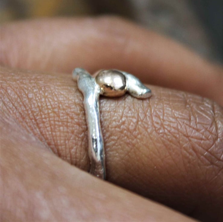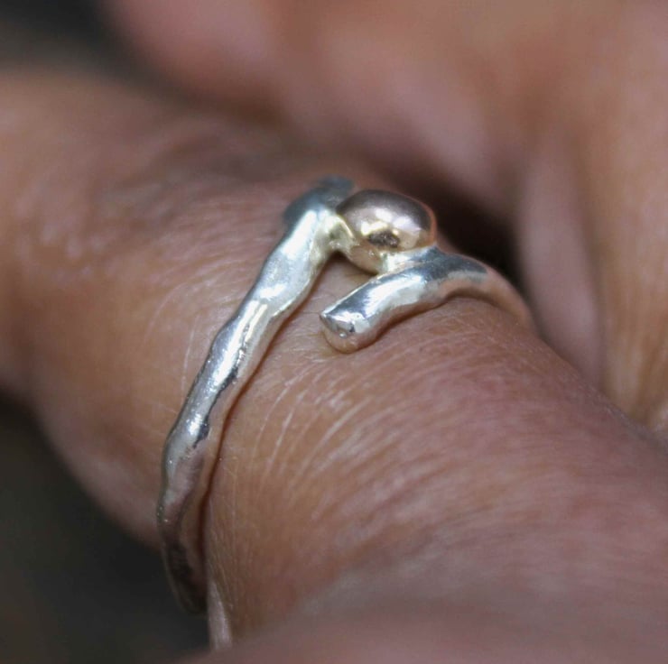 We like making this naturally shaped free form silver and gold ring. Made with a 0.6g 9ct Rose Gold pebble and an organic shaped, molten 925 silver band.