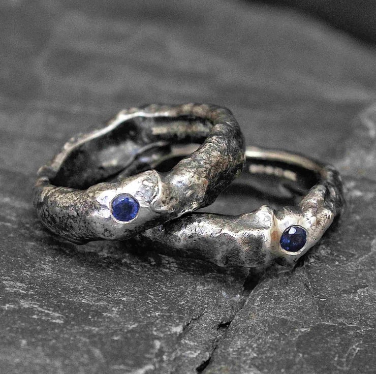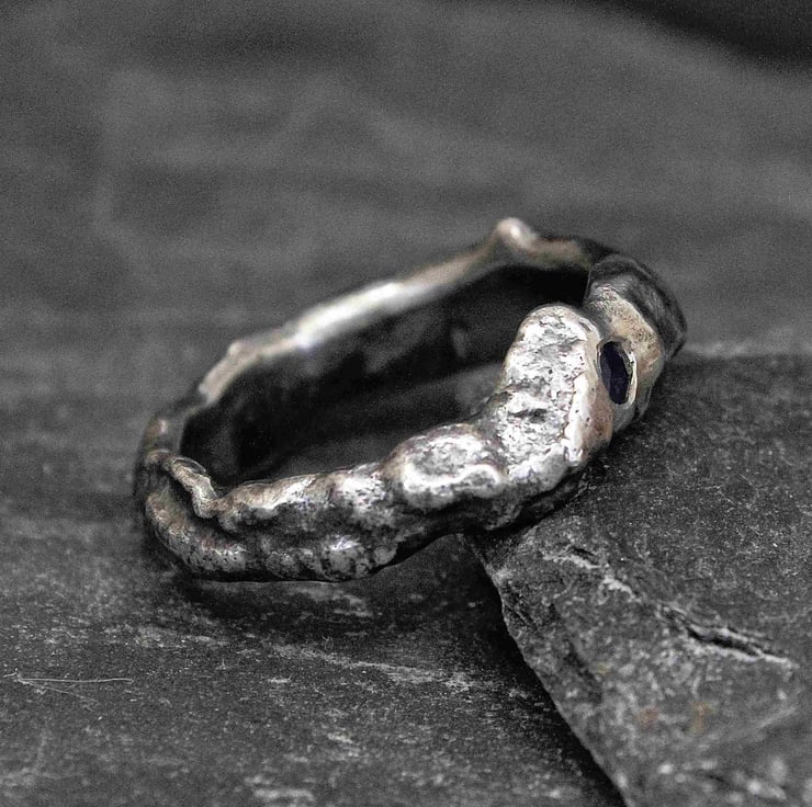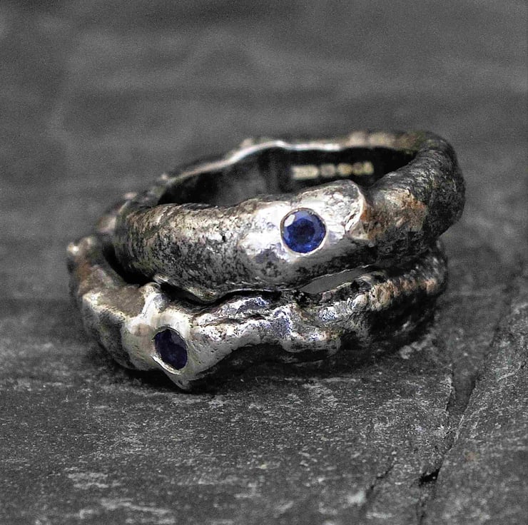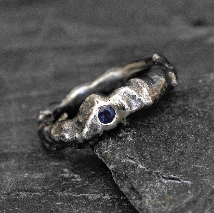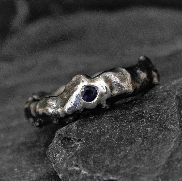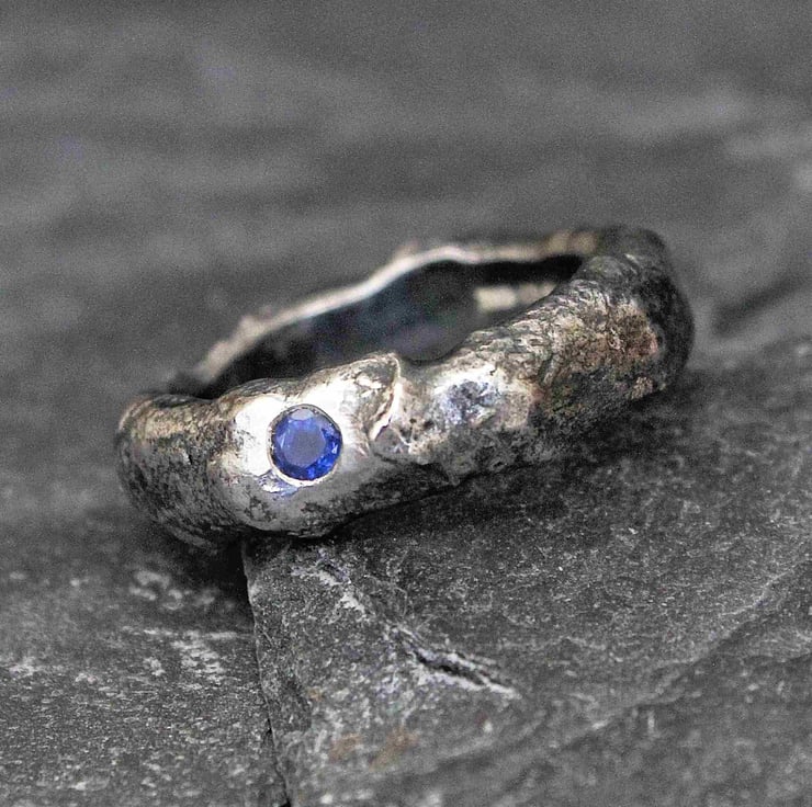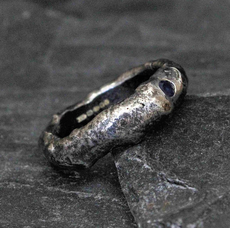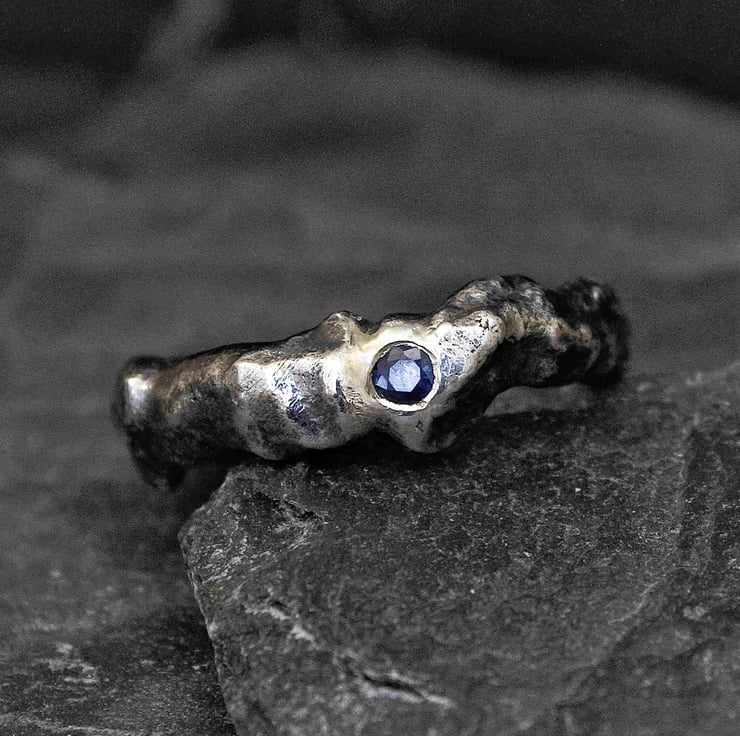The 'Sapphire Big Rock' is a solid piece of statement jewellery. The chunky, volcanic free form shapes are lightly oxidised for a rustic look. A deep blue sapphire is flush set for a focal feature. It's made from recycled silver that we melt and fuse to create the natural shapes. This makes each 'Rock' completely unique.