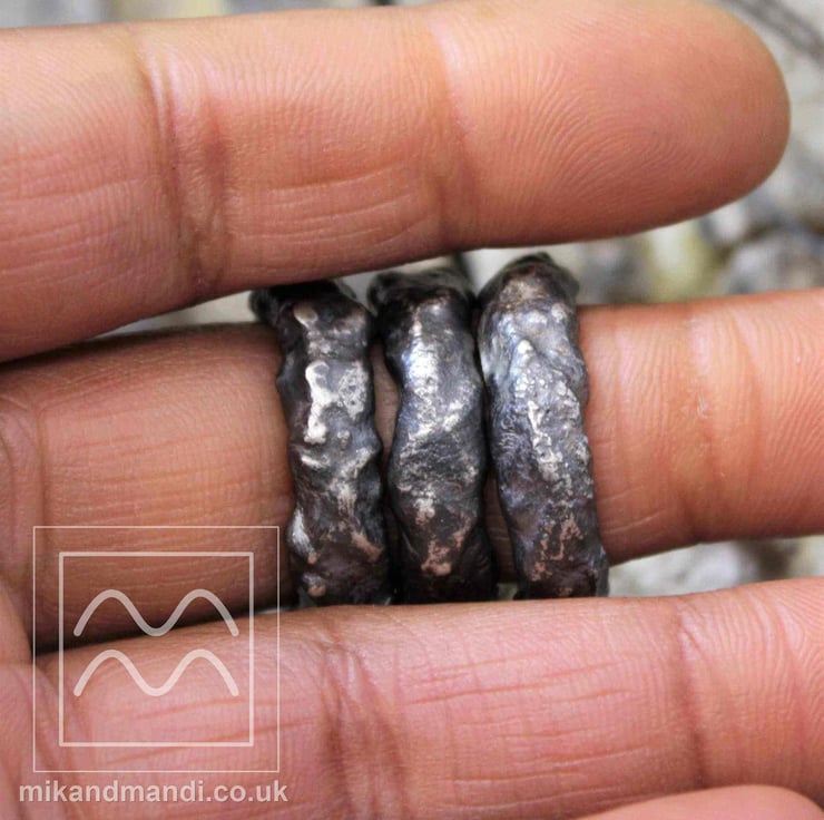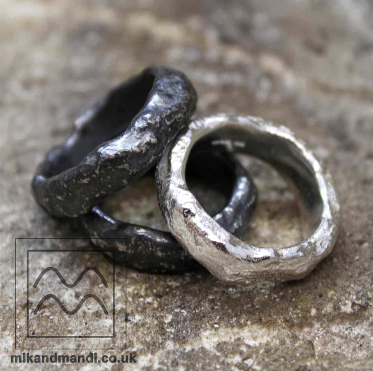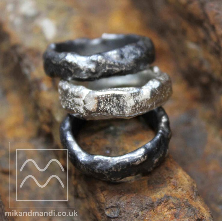 Mandi and I spend a lot of time walking in nature with the children. We love going up in the hills and mountains and really appreciate the beauty of the rocks that cross our path. The unpredictable and naturally formed textures is what draws you in. When we make the pieces in the rock series we try to sculpt and let the silver solidify in these natural shapes.