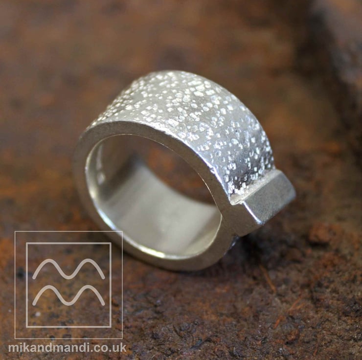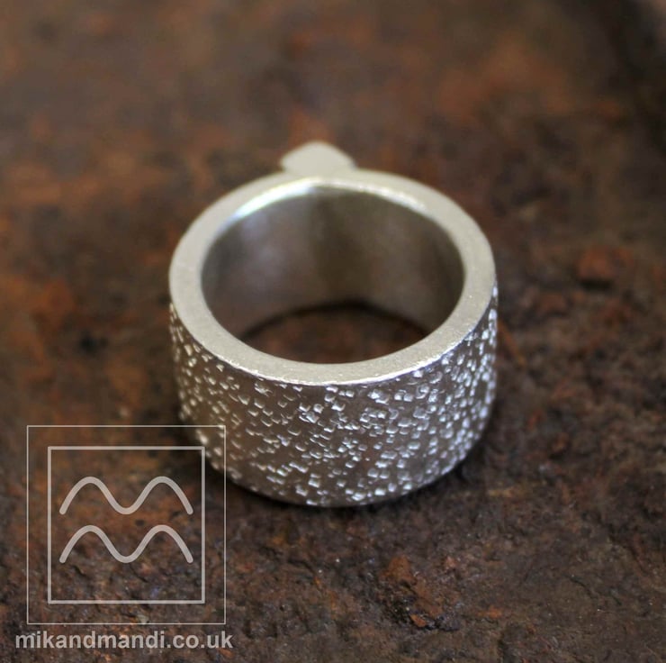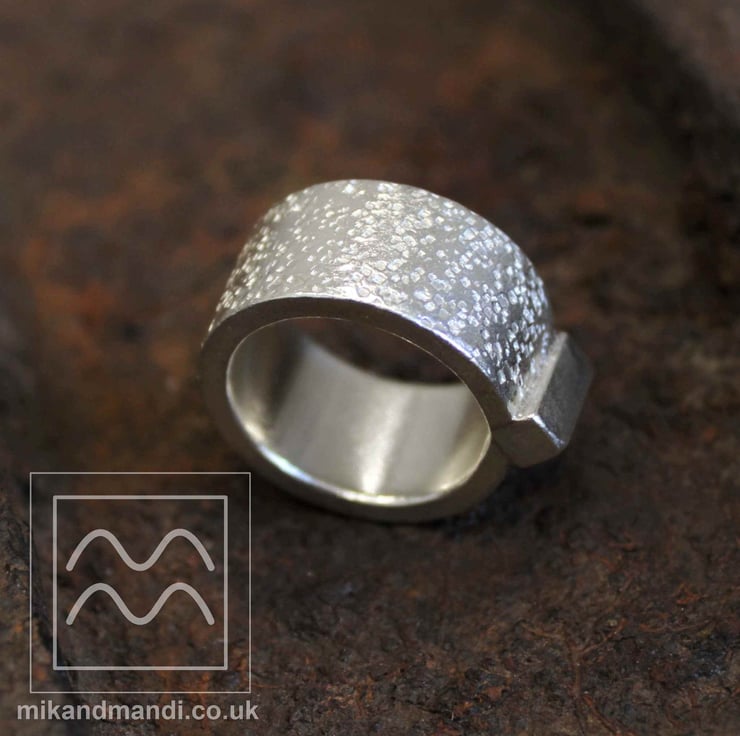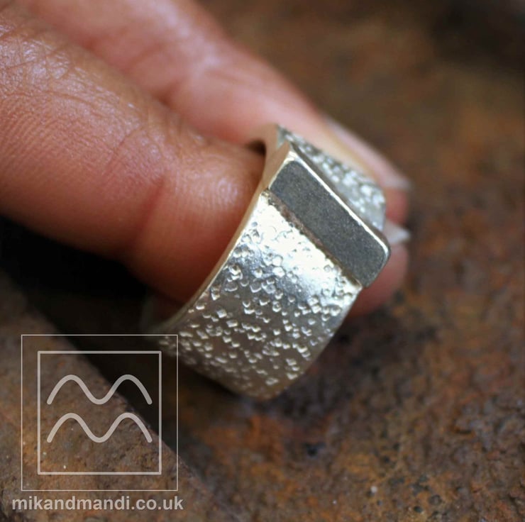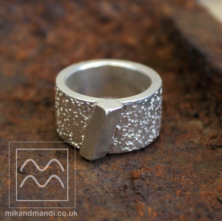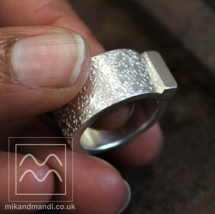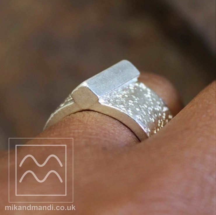 This is inspired by signet rings. Mik likes heavy pieces to wear and the significance of a signet, which is really a type of signature. The band is really solid but textured, signifying strength that has been tested by time. The square bar represents organising, planning and building for the future, but is placed at an angle, as everything we do will always find its own way.