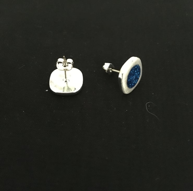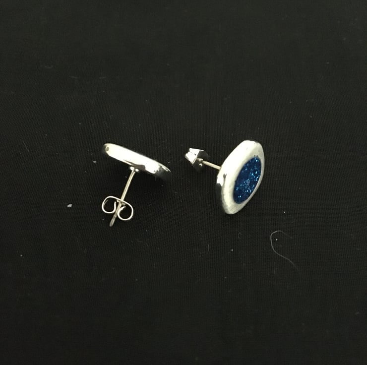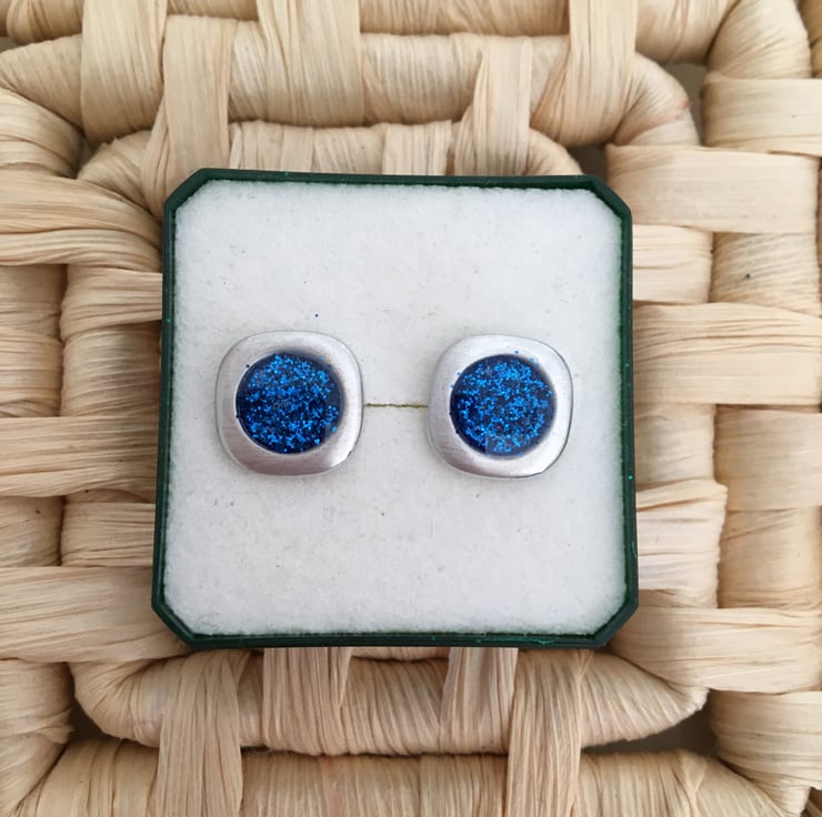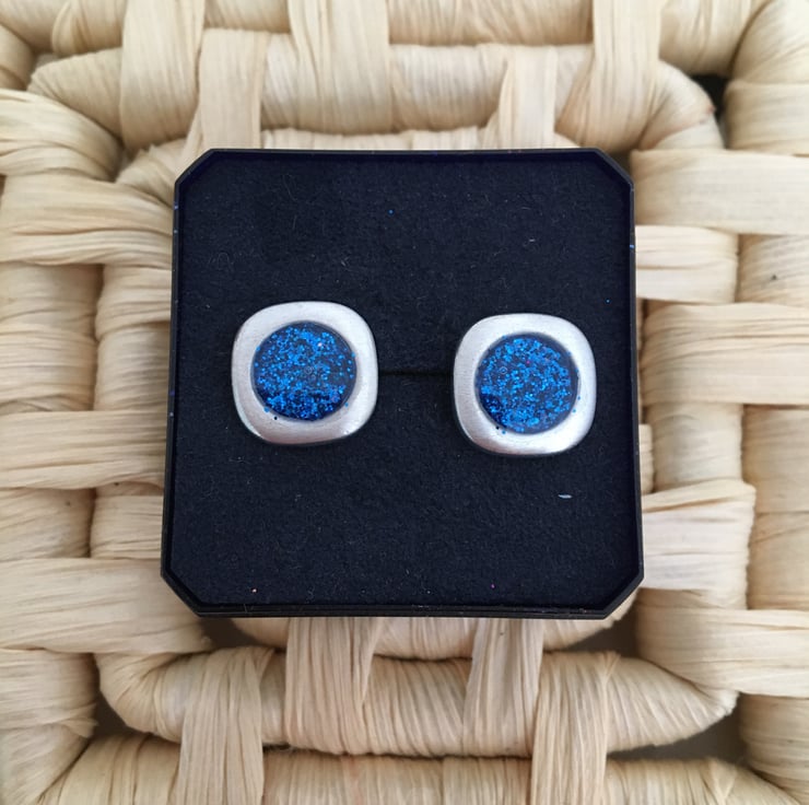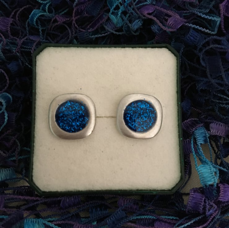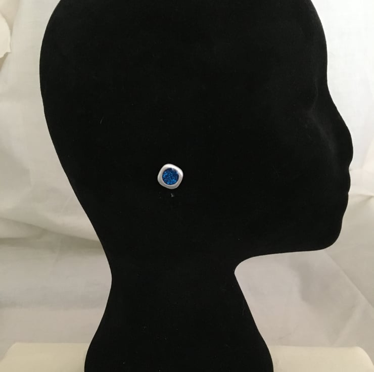Pretty handcrafted vibrant blue stud earrings with a silver satin surround