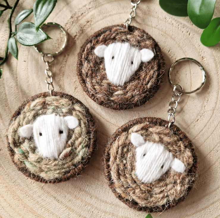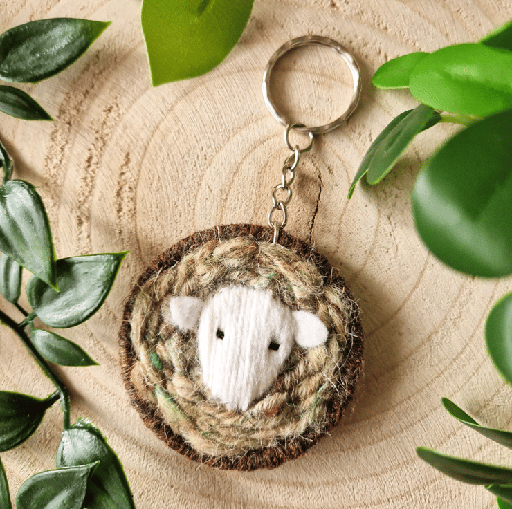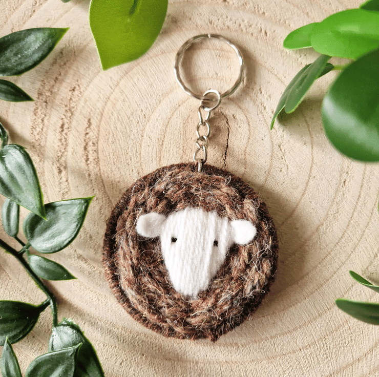A charming Herdwick Sheep keyring handcrafted by weaving British Herdwick Wool. The face is handstitched with adorable felt ears. The sheep measures approximately 6cm across, featuring a 5cm keyring attachment. Please note that the available hues include Grey, Brown, and Greenish variations of British Herdwick yarn.. Choose your preferred hue when making a selection.