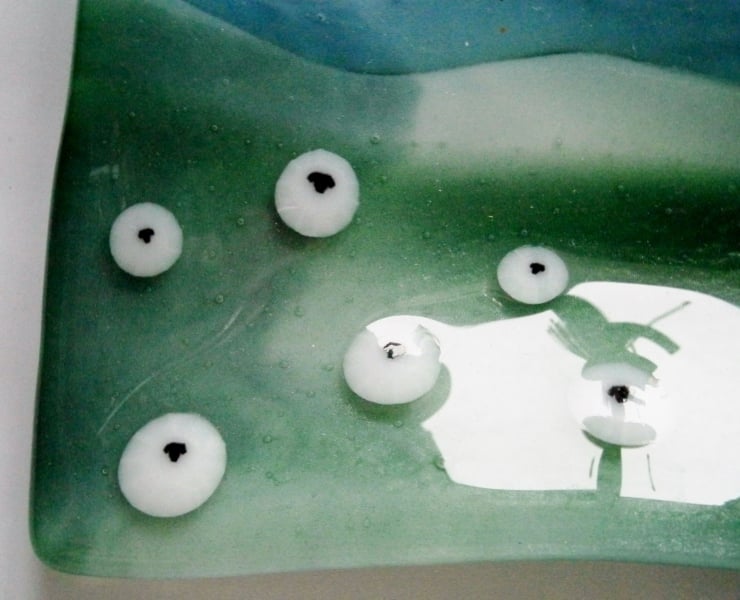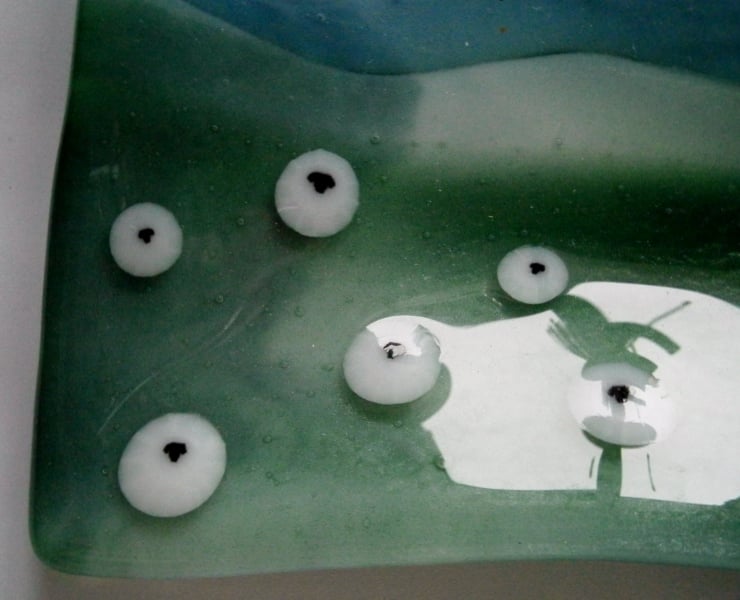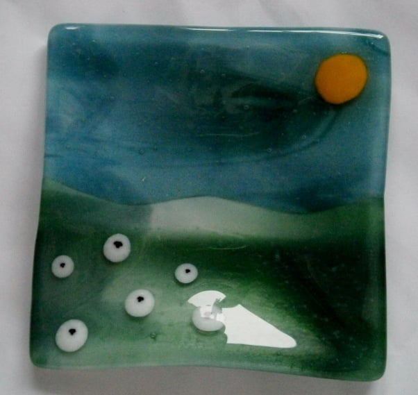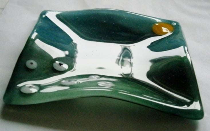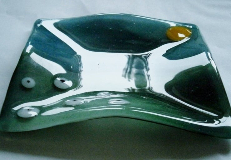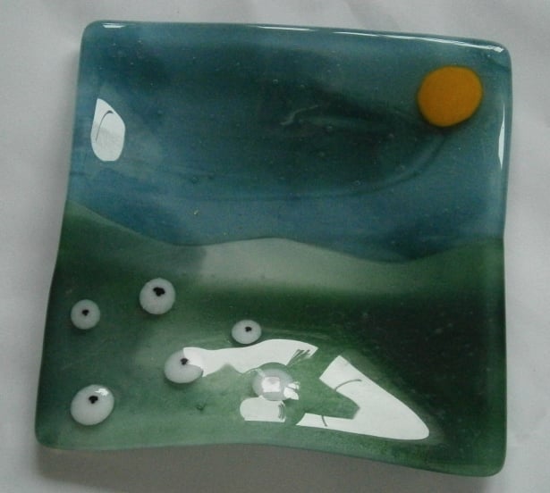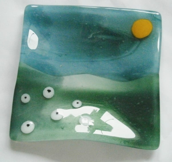 This beautiful piece of fused glass art measures approximately 13 square centimeters and stands about 2 centimeters high at the top of the wave.