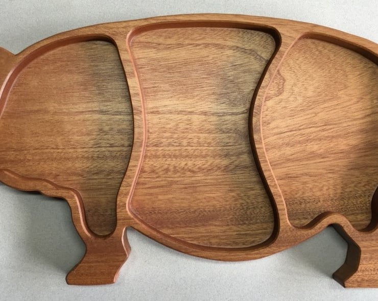 Large Pig Snack Bowl, designed and handmade by me from Sapele (dark coloured hardwood of the Mahogany family) and then finished with inert food safe Osmo Top Oil. This brings out the beauty of the timber, protects and waterproofs the wood.