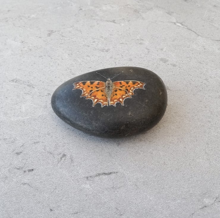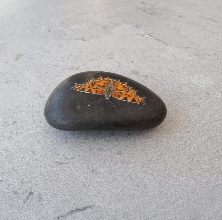 My Comma butterfly stone has been hand painted in quality acrylic paints and finished with three coats of acrylic sealer which gives them a smooth tactile finish.
