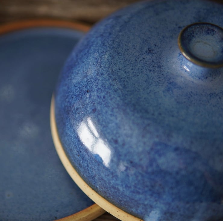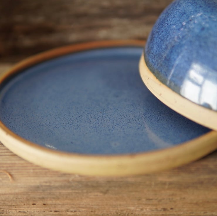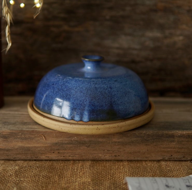 Cheese dish crafted on the potter's wheel in a speckled stoneware clay and finished in a beautiful multi tonal blue glaze.