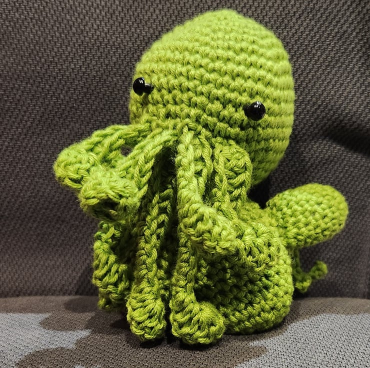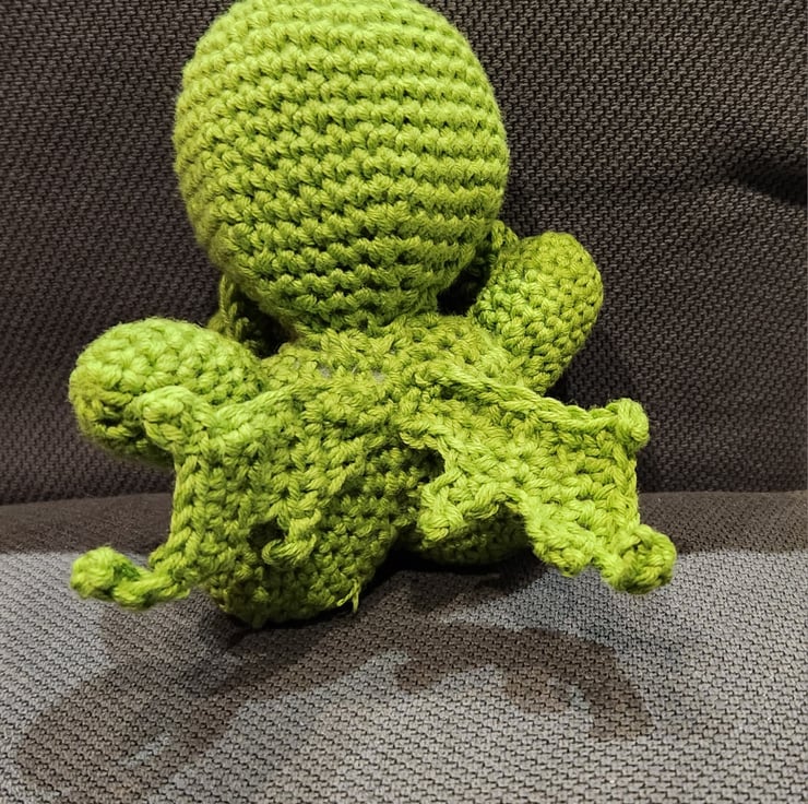 An amigurumi Cthulhu figure crocheted in green cotton/ acrylic yarn. Stuffed with toy stuffing, black safety eyes. He measures approximately 12cm high.