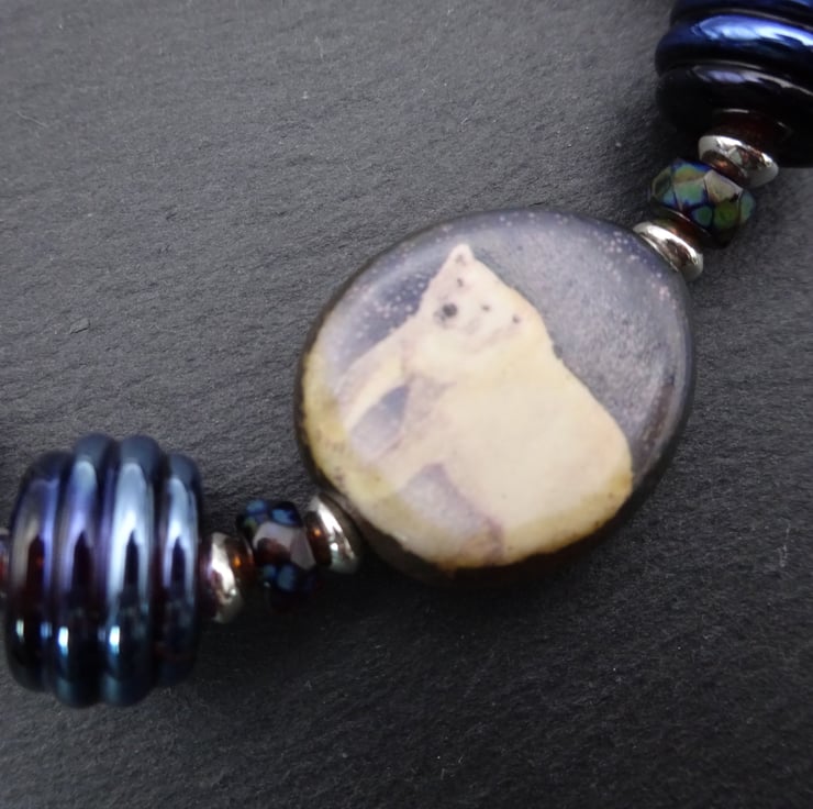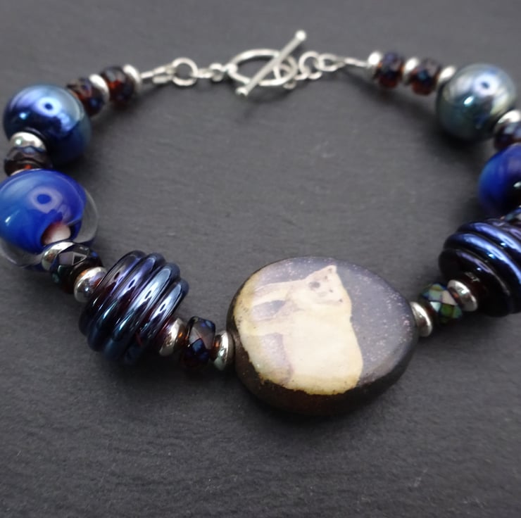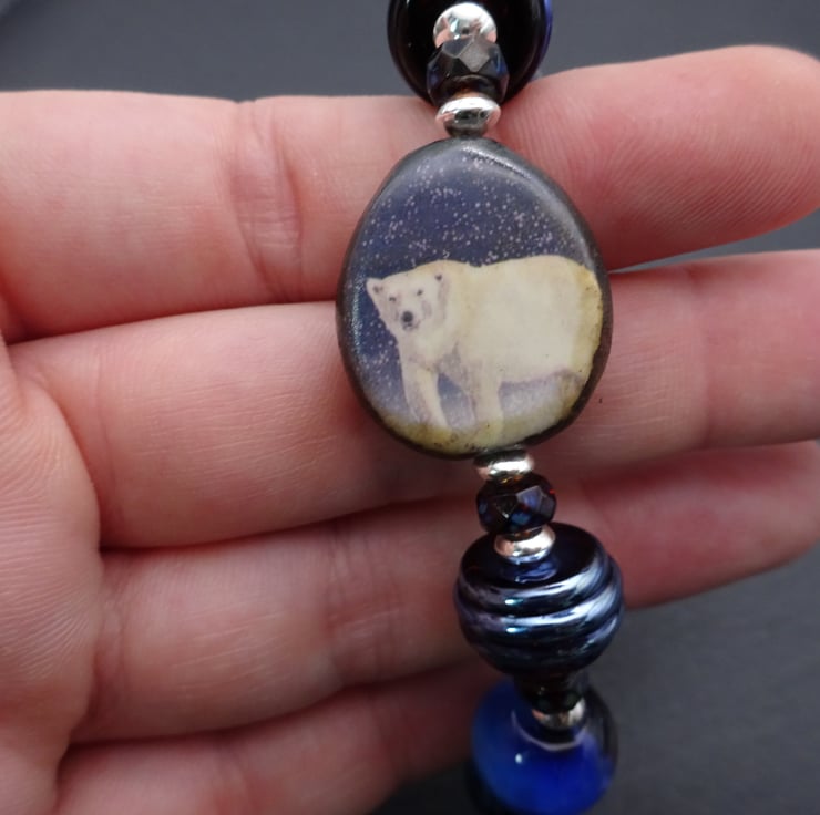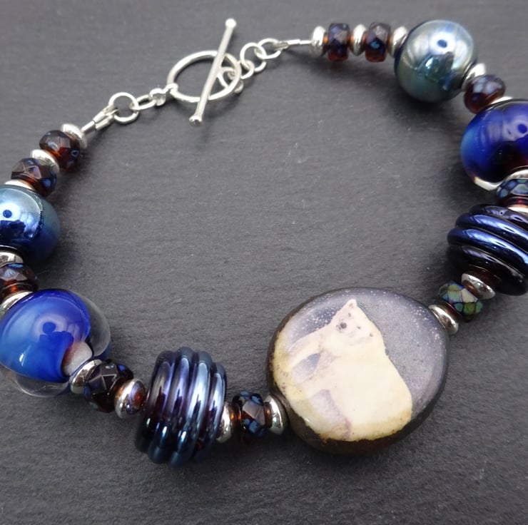 A bracelet made handmade lampwork glass beads, Czech glass beads and sterling silver beads. It features a handmade ceramic polar bead as a focal.