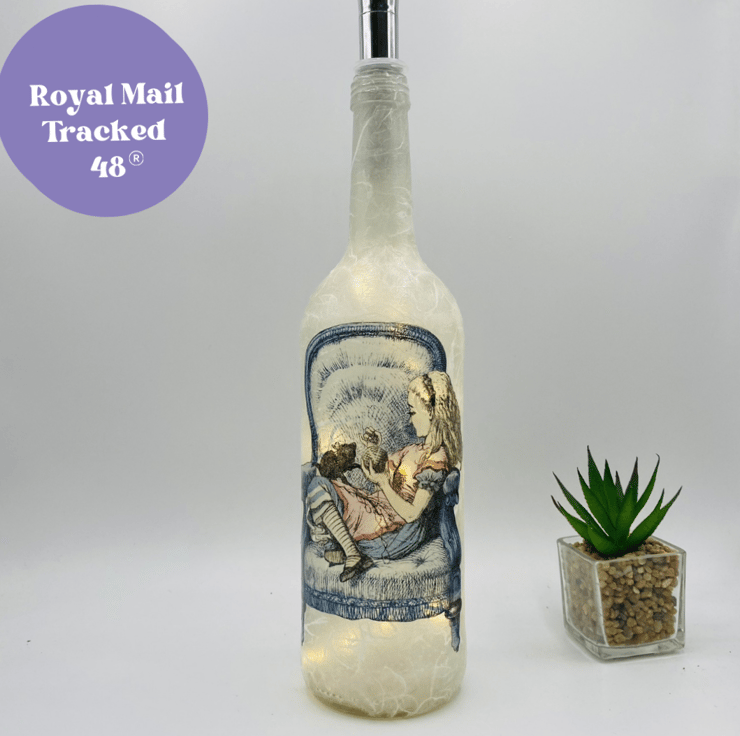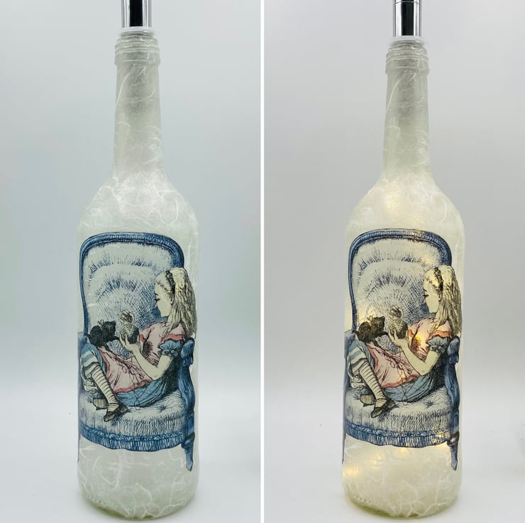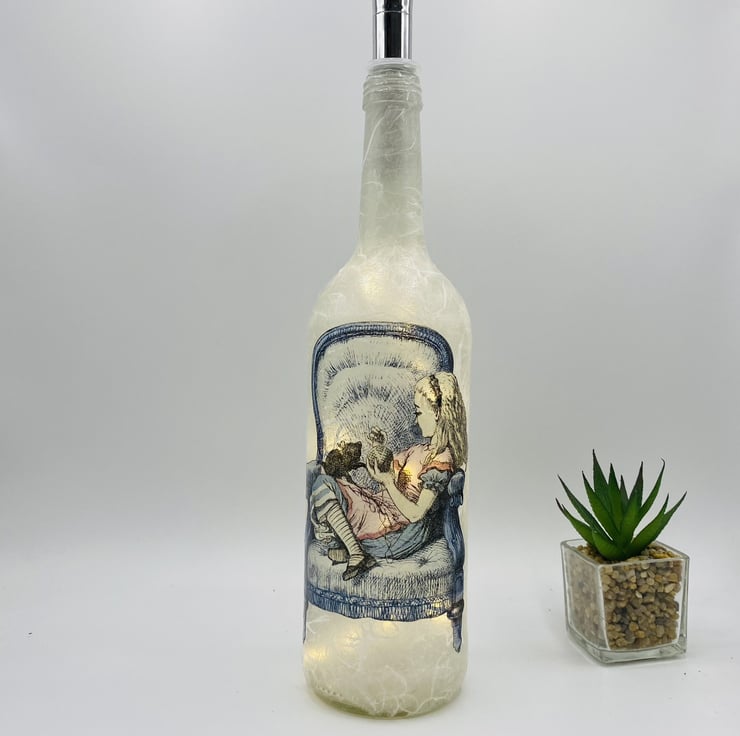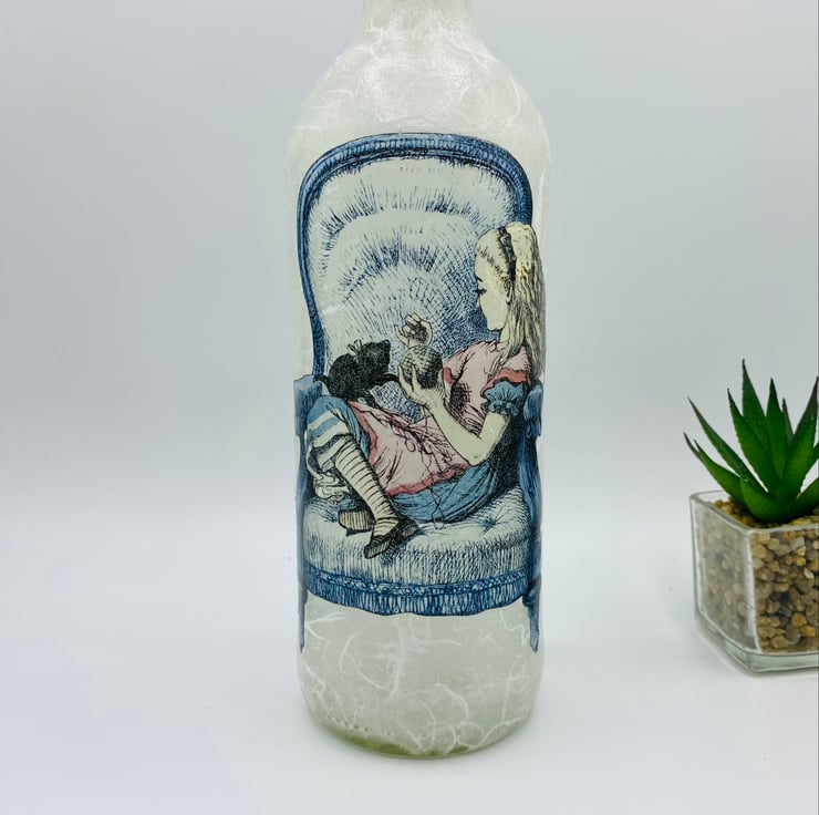Decorated wine bottle, decoupaged with white mulberry paper featuring Alice in Wonderland sitting in an oversized chair.