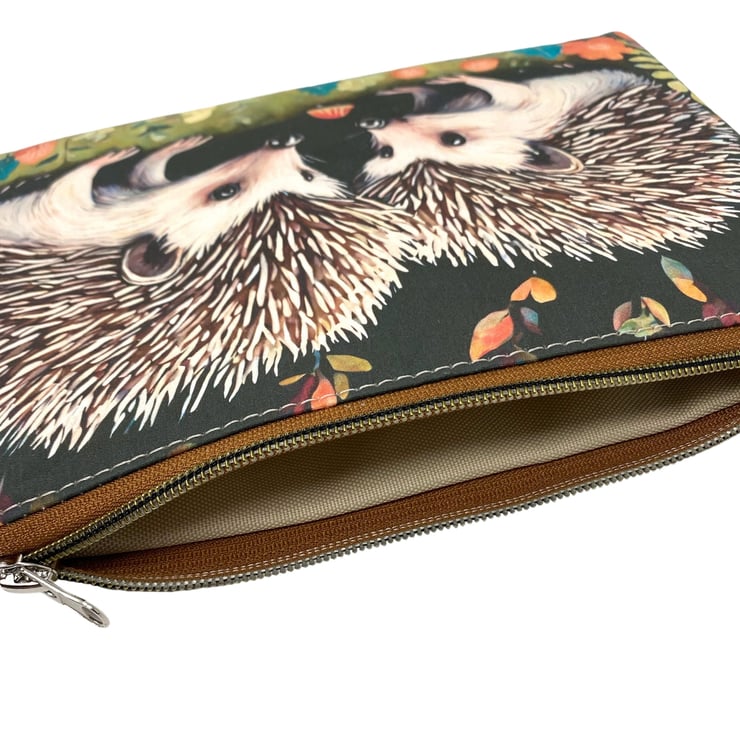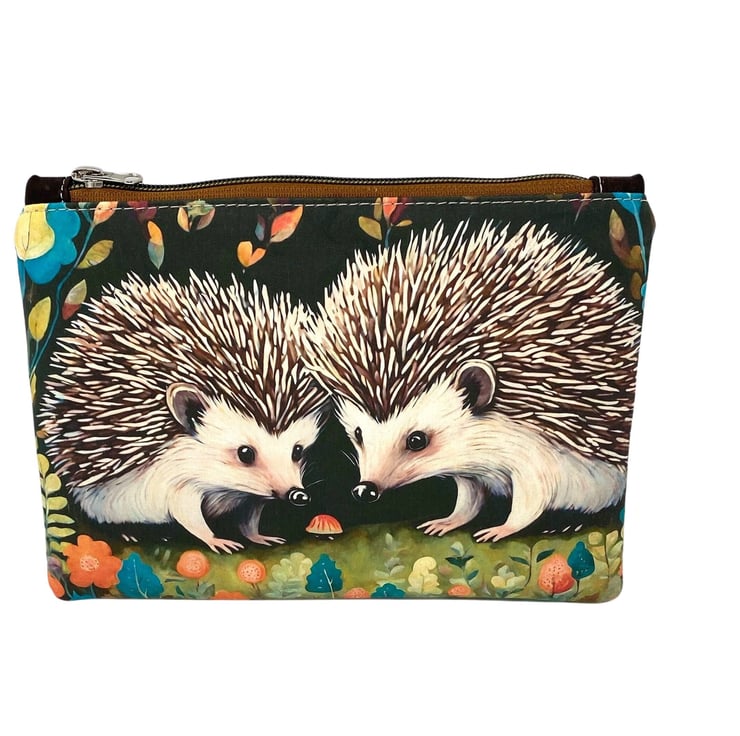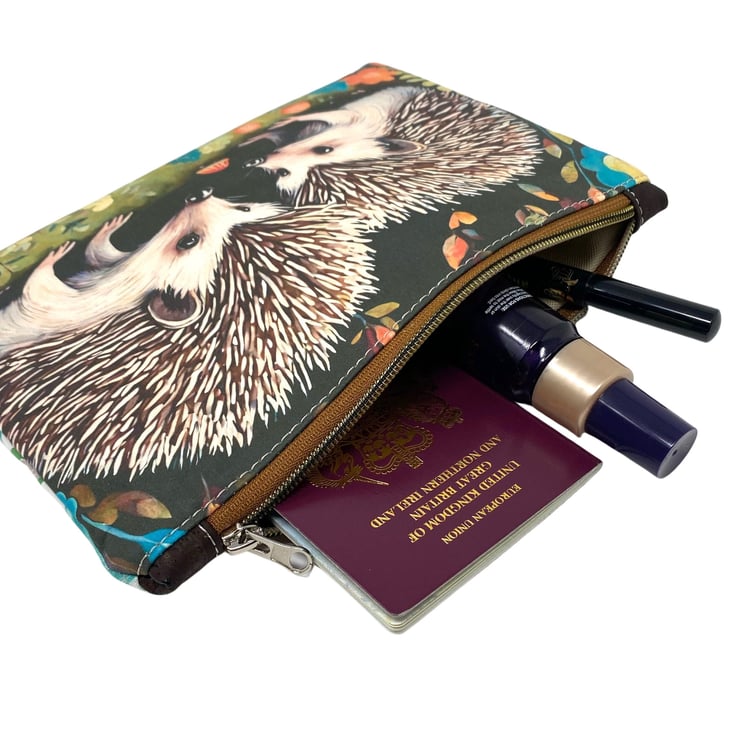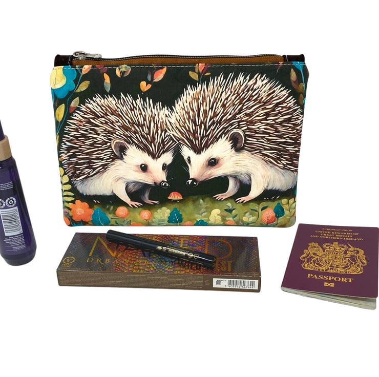 Very cute multi-use pouch featuring two adorable hedgehogs. This fabric is exclusive to Corkadoodle Bags. It can hold anything from makeup and toiletries to passports, phones, Kindles, nappies, wipes or use as a pencil case! Perfect as a gift or to treat yourself.