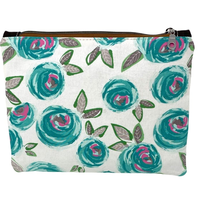Hedgehog fabric to the front and turquoise rose fabric to the back. Zip closure to the top and inside lined with beige waterproof canvas.