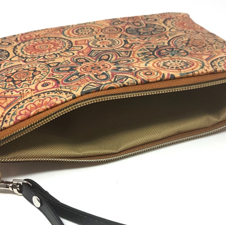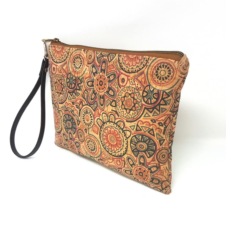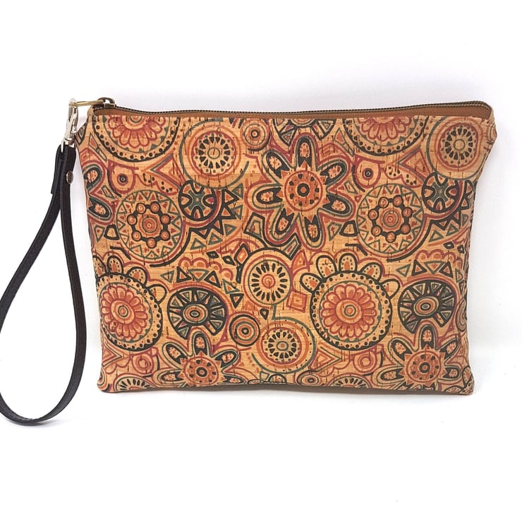 Stunning cork leather vegan wristlet clutch bag in a beautiful ethnic symbols print. Cork is beautifully soft and supple yet makes a very sturdy quality bag. Treat yourself or ideal as a gift!!