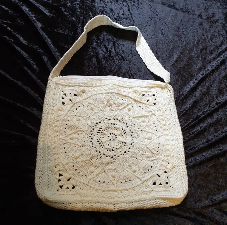 Beautiful handmade crochet bag, using a super soft white yarn.
