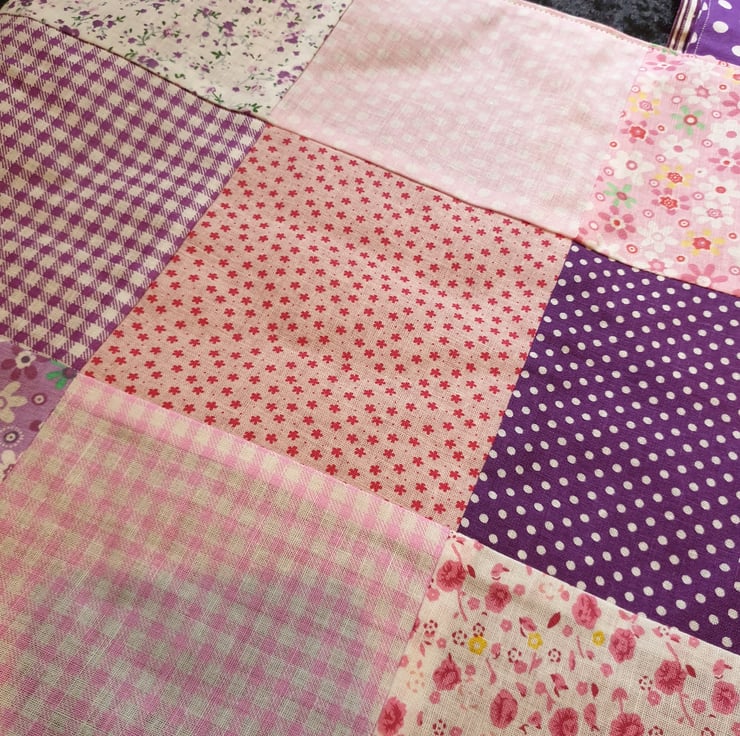 Each individual square has been cut 5" by 5" and sewn together to form the front and back panel and for both bag handles.