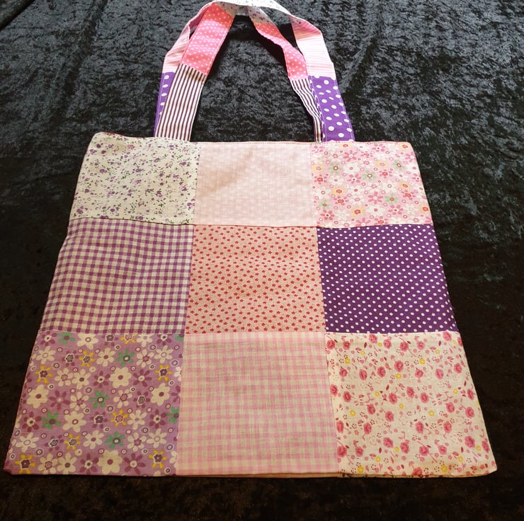Handmade patchwork tote bag fully lined in a red cotton fabric.