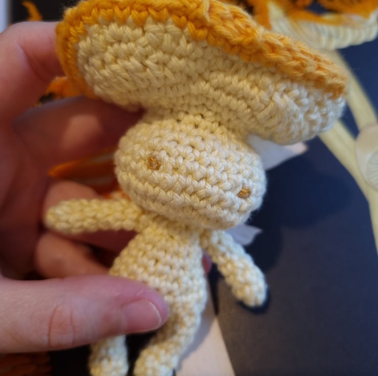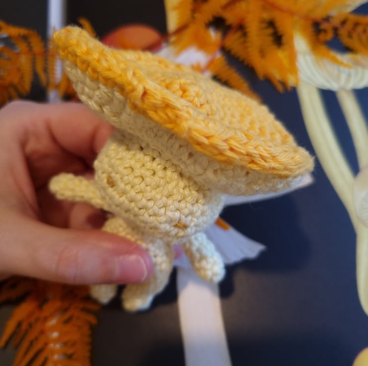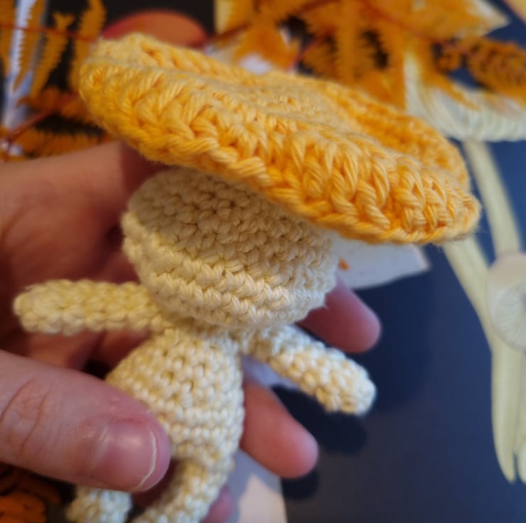 A cute little mushroom sprite doll handmade by me (crochet) with 100% cotton yarn. The eyes are embroidered on and the doll is filled with polyester toy stuffing.
