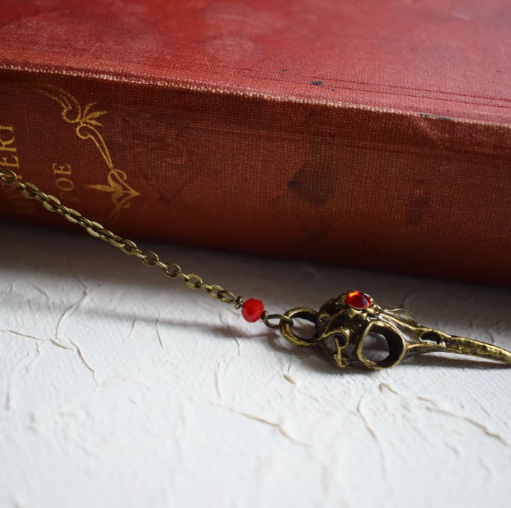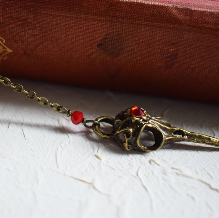 This one is made with a bronze dragon which has been hung, by way of bronze plated chain, with a raven skull pendant. The skull has been set with a blood red rhinestone to match the opaque glass beads I have used with the chain,