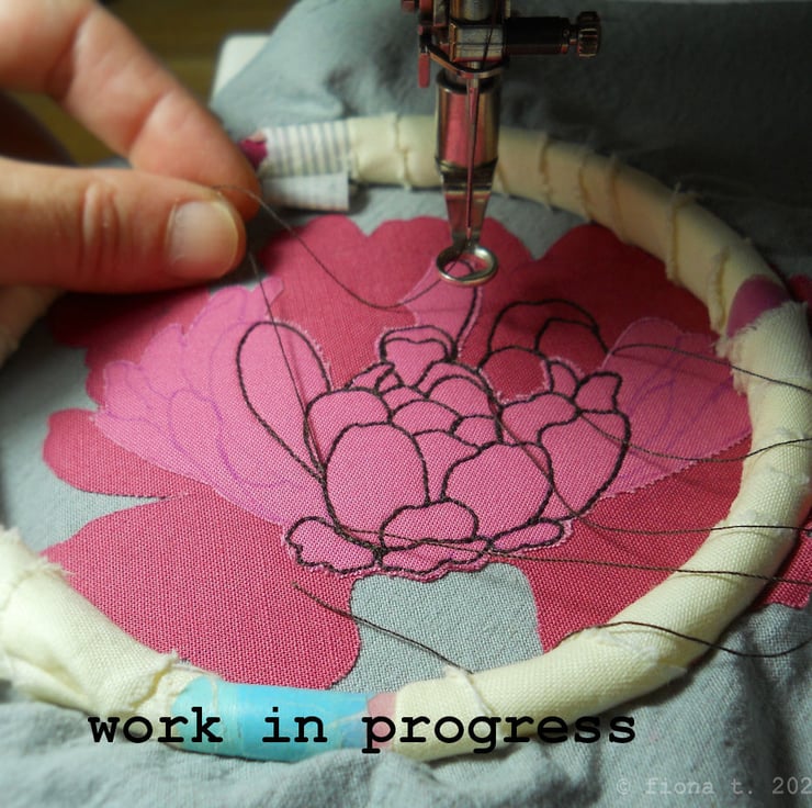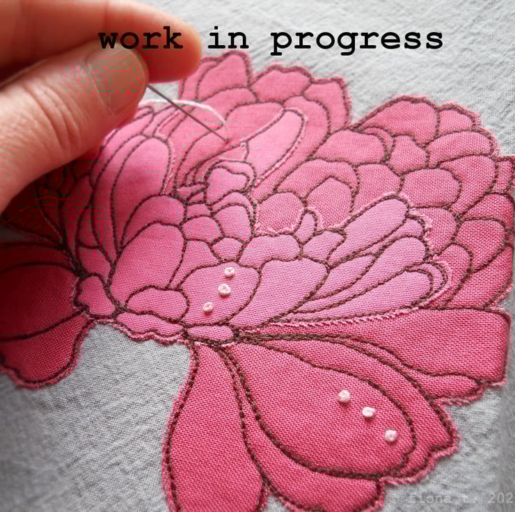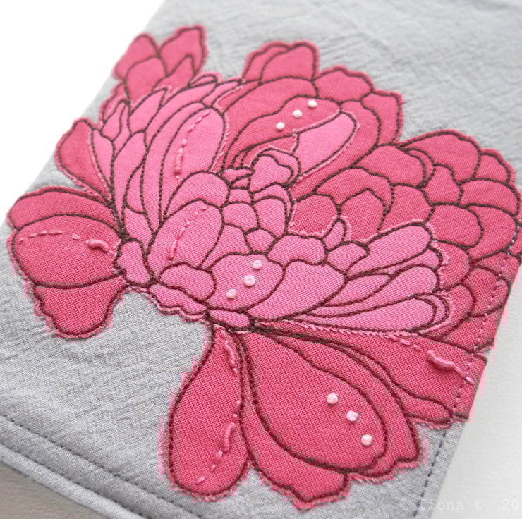 translated from my original pencil sketch, this flower is free hand embroidered in deep rose and blush pink cottons on to hand dyed grey cotton calico.
