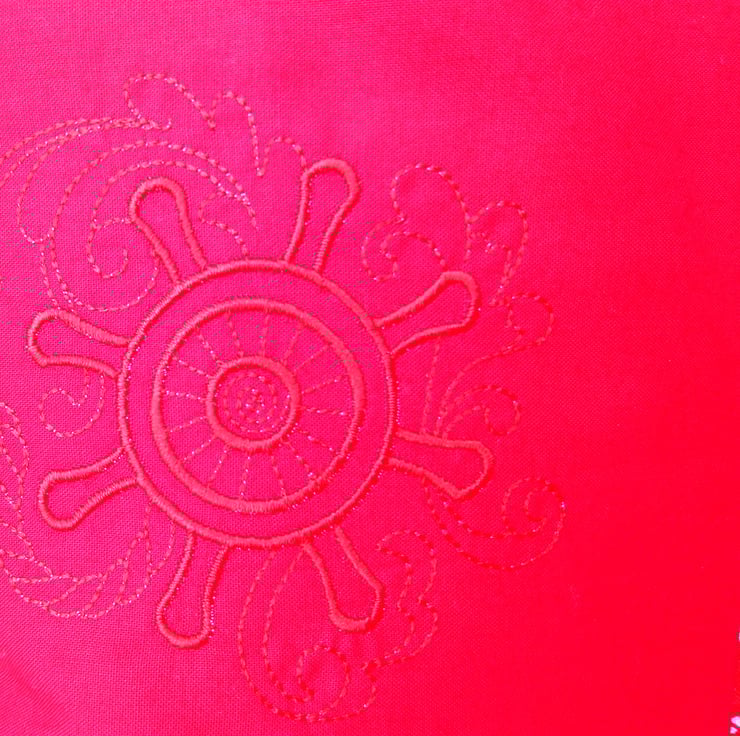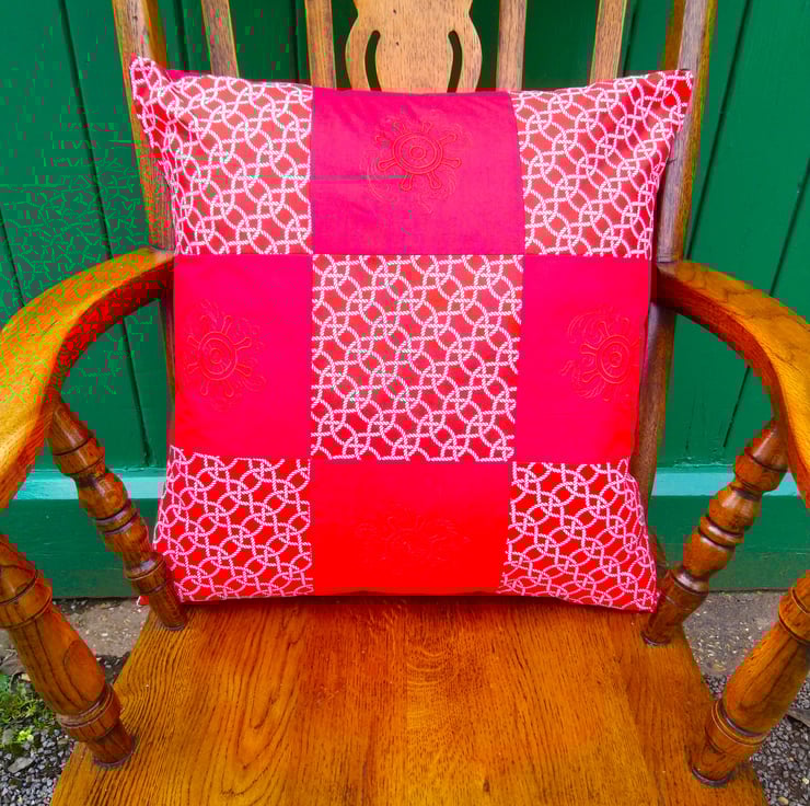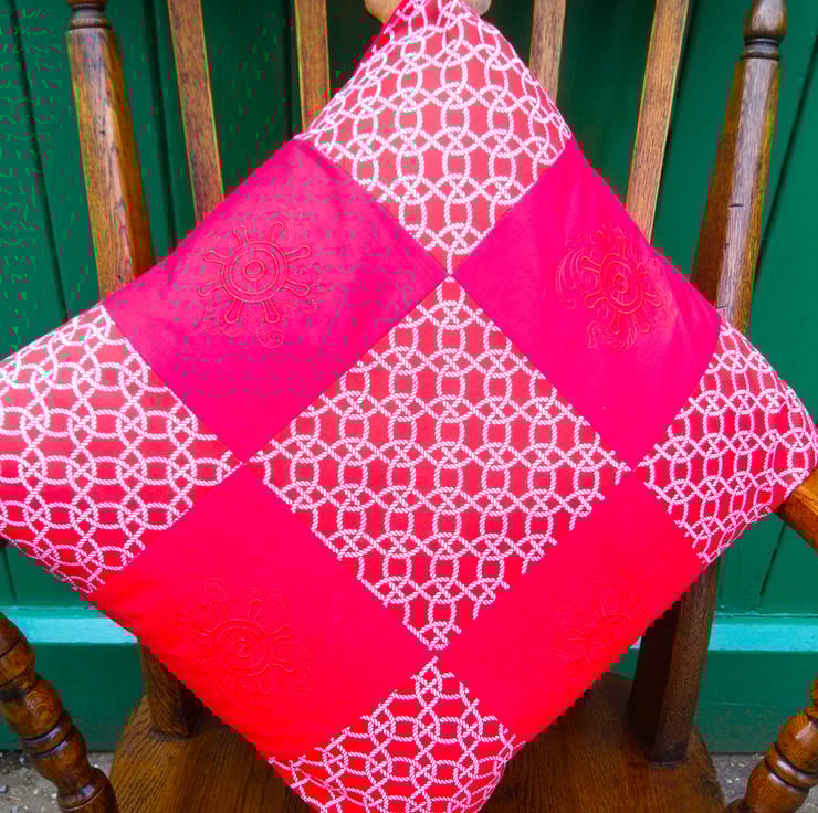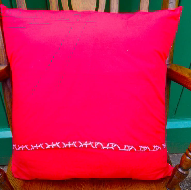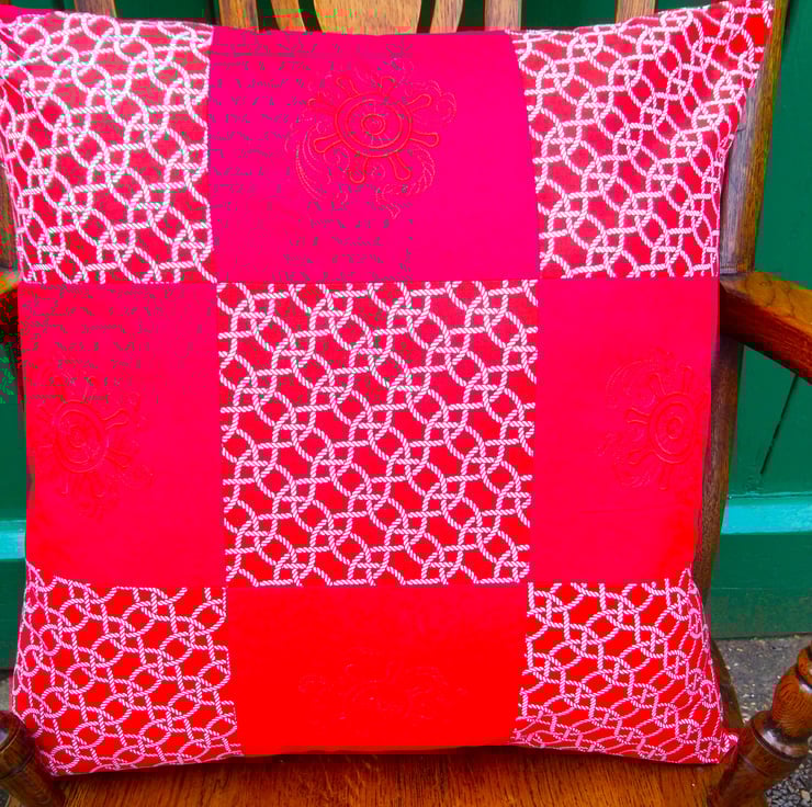 This Cushion Cover is made up of 9 x 16.5cm squares in red and white 100% cotton fabric. Patterned squares show a rope nautical style pattern. The plain red squares have been embroidered in self colour embroidery thread of a nautical reel. The back is plain red with an envelope opening. The opening is bound in the patterned fabric.