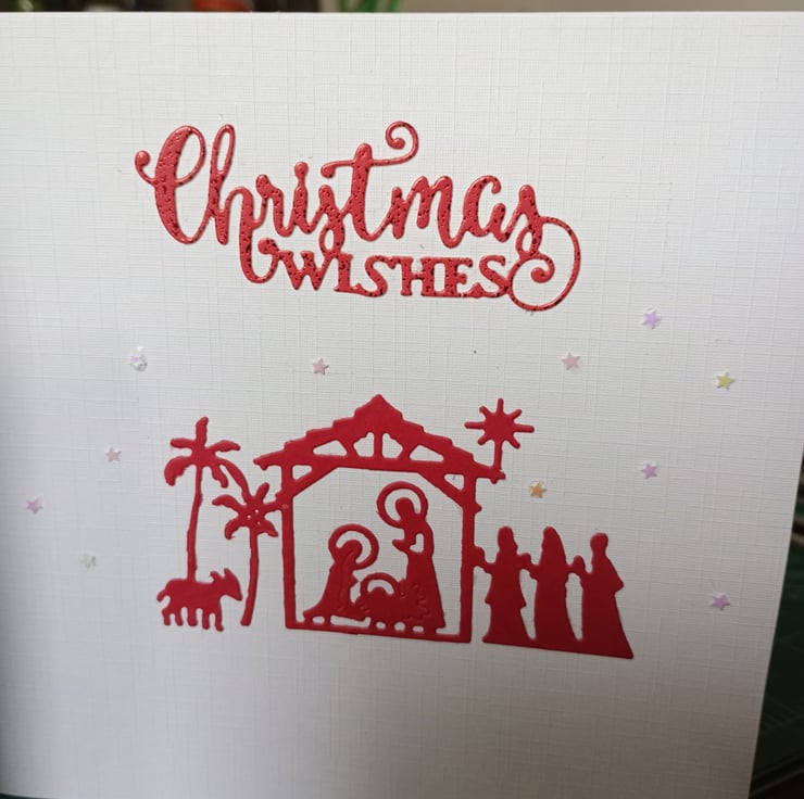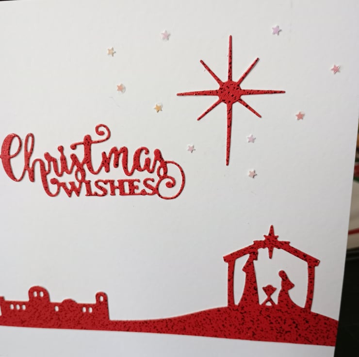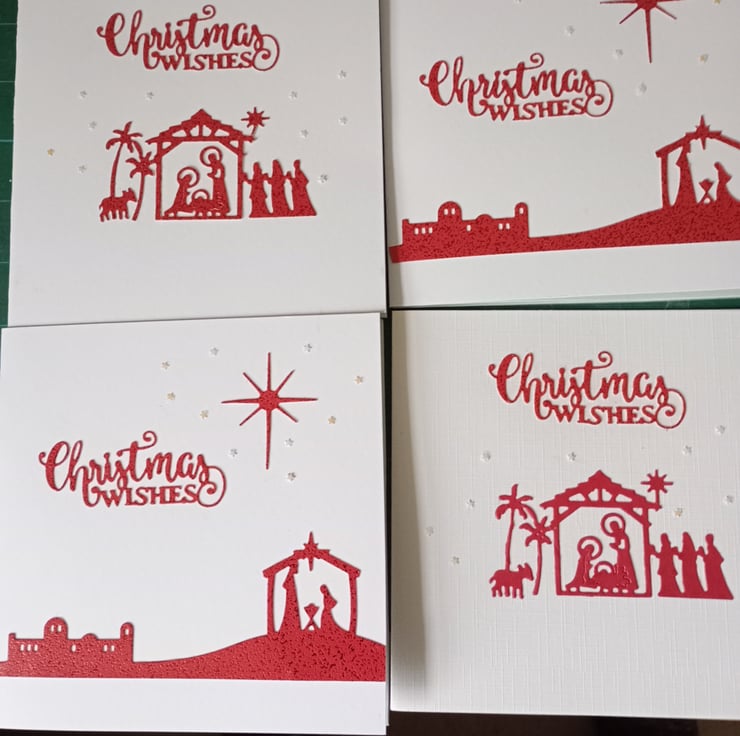 A completely handmade and uniquely designed pack of 4 cards. Two each of two designs. Both nativity scenes. Die cut from red card. Embellished with Christmas wishes and the northern star. Finished off with tiny holographic stars. All mounted onto quality pristine white card