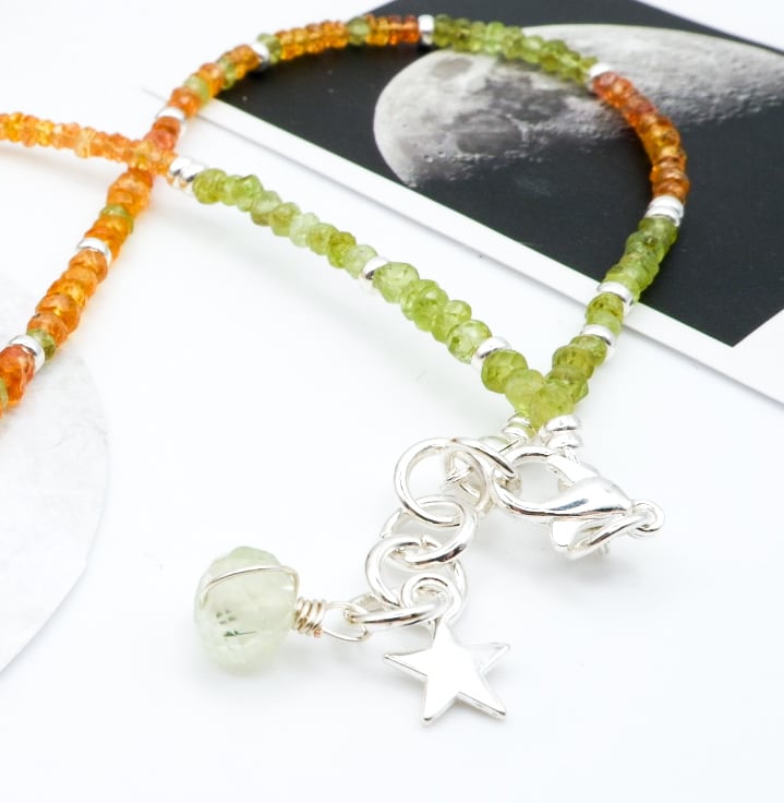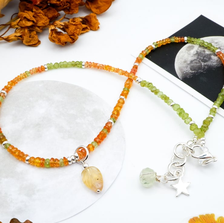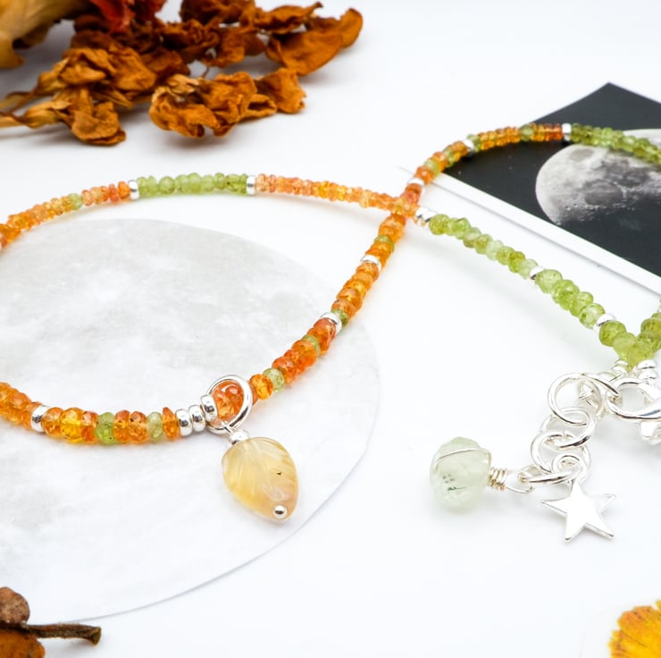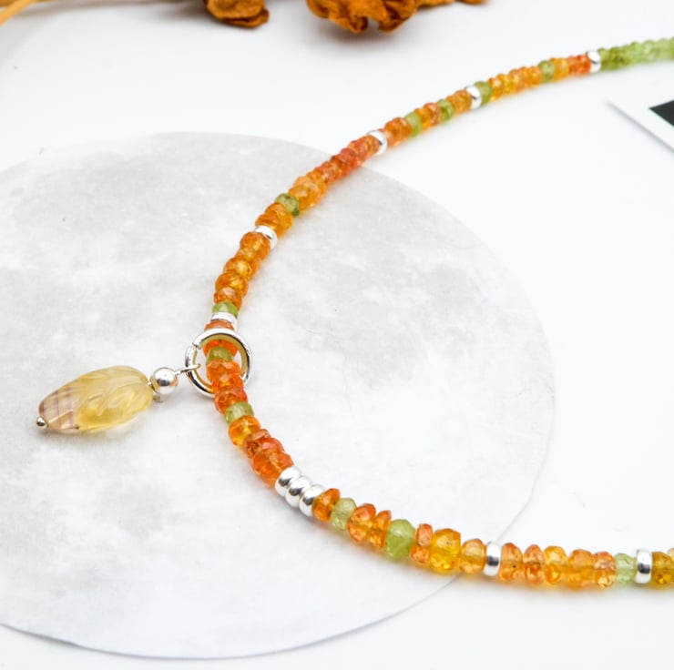 This beautiful Citrine and Peridot gemstone beaded necklace has been handmade with lots of love in the East Midlands using sterling silver components, and a dainty hand-carved Fluorite gemstone leaf pendant.