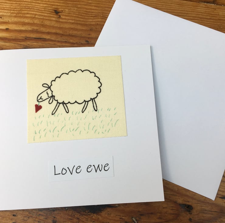This unique handmade card has an endearing sheep eating a red heart flower standing in a field of grass.