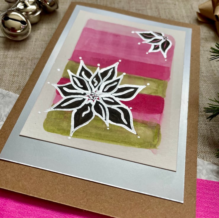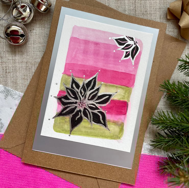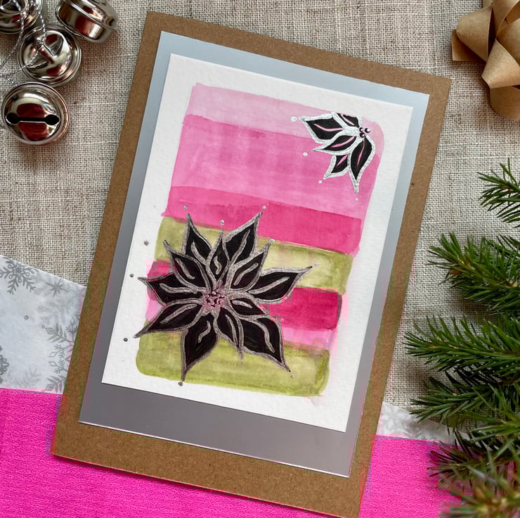 Hand painted one of a kind, contemporary Christmas card, featuring a watercolour striped background in Barbie pinks and greens over painted with poinsettia leaves in black and silver, it has then been mounted onto complimentary coloured silver card prior to being mounted onto a brown recycled card and is left blank for your own message.