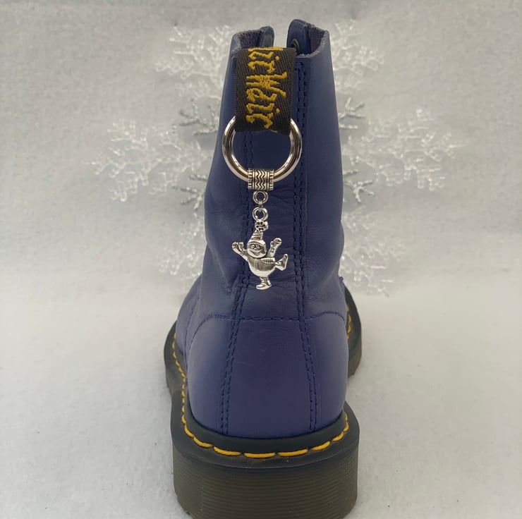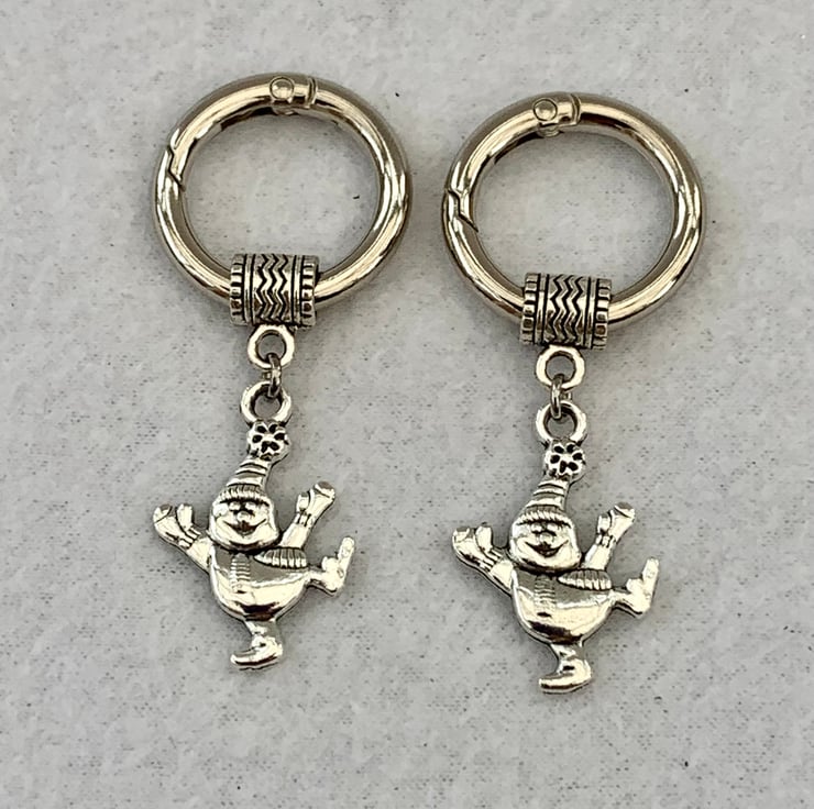 Alloy dancing snowman pendant measuring 30 x 21 x 2.5mm fitted with a stainless steel jump ring (for strength and longevity) onto a decorative alloy pendant bail and hung from a platinum coloured zinc alloy spring O Rings measuring approximately 27mm outer diameter, 4mm thick with a 20mm inner diameter.