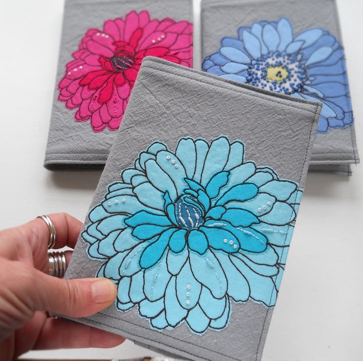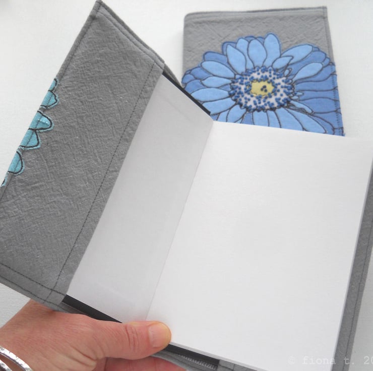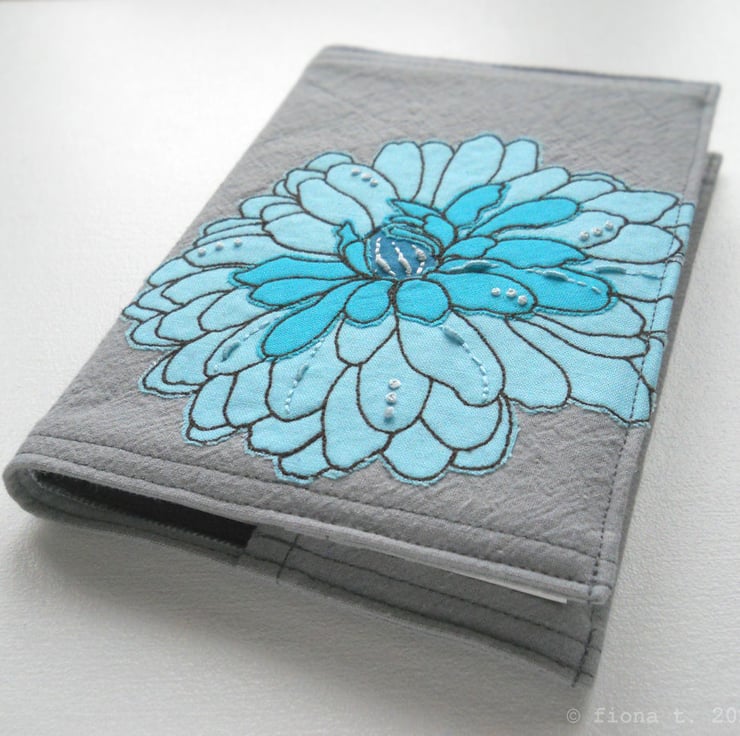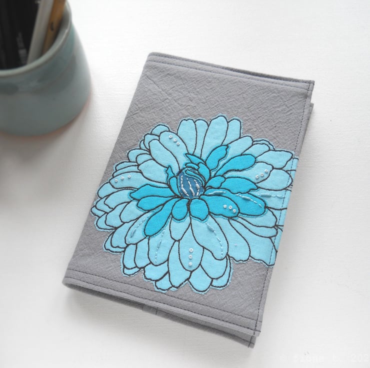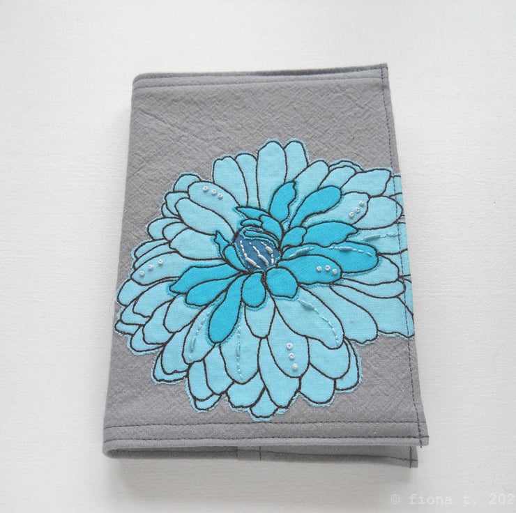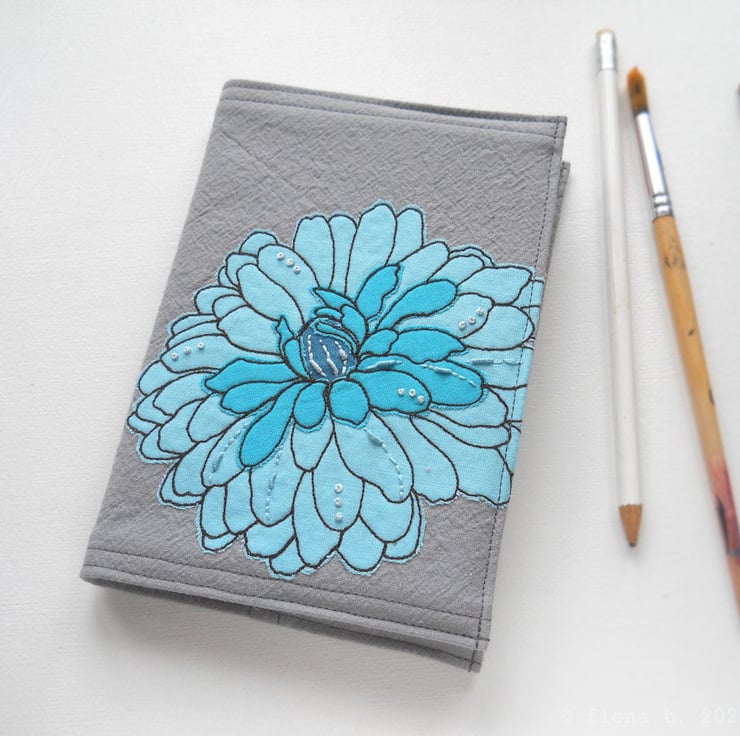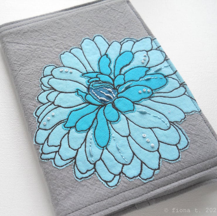 free motion and hand embroidered A6 notebook cover with sketchbook inside – teal turquoise